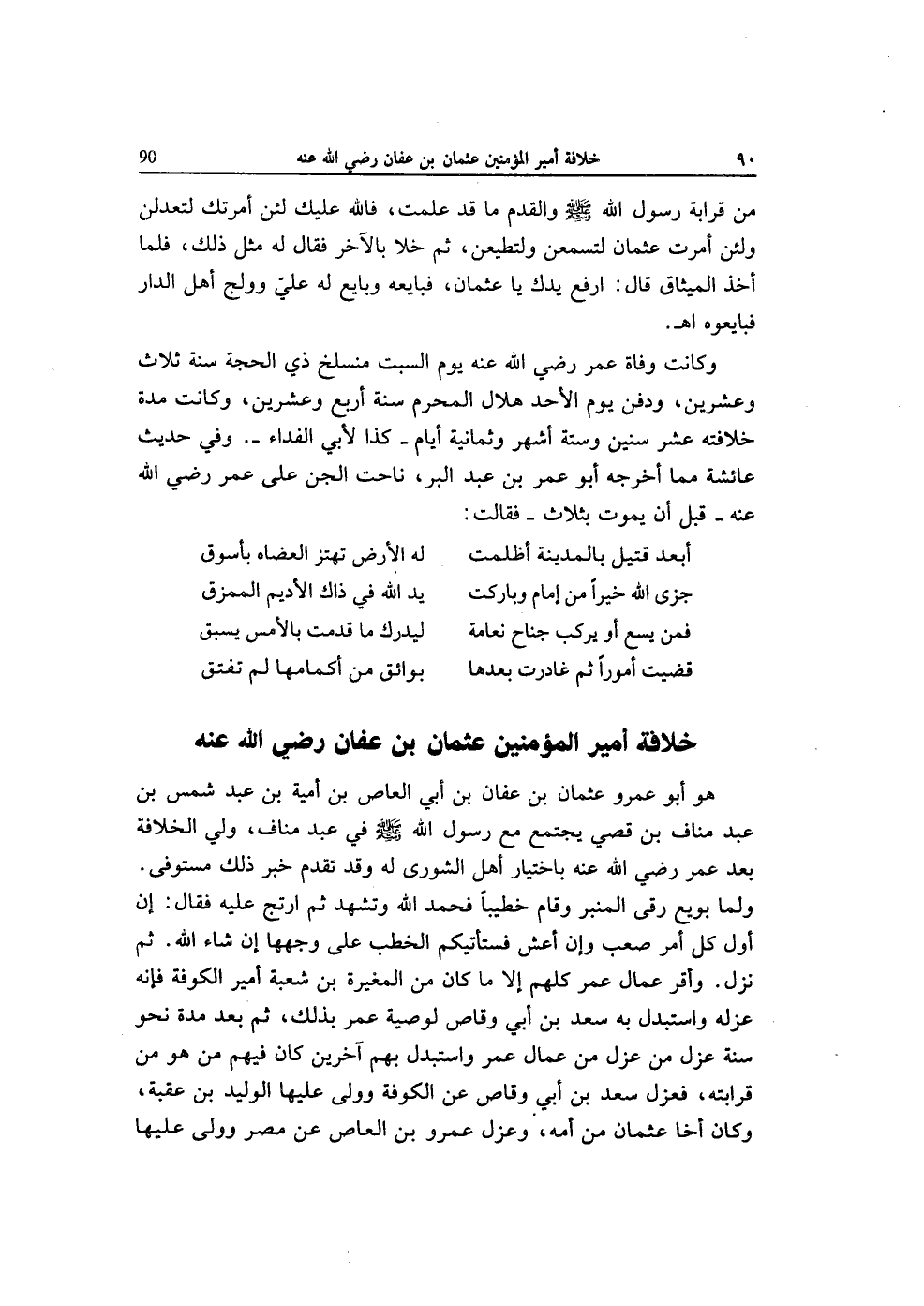 هُوَ أَبُو عَمْرو عُثْمَان بن عَفَّان بن أبي الْعَاصِ بن أُميَّة بن عبد شمس بن عبد منَاف بن قصي يجْتَمع مَعَ رَسُول الله صلى الله عَلَيْهِ وَسلم فِي عبد منَاف ولي الْخلَافَة بعد عمر رَضِي الله عَنهُ بِاخْتِيَار أهل الشورى لَهُ وَقد تقدم خبر ذَلِك مُسْتَوفى وَلما بُويِعَ رقى الْمِنْبَر وَقَامَ خَطِيبًا فَحَمدَ الله وَتشهد ثمَّ ارتج عَلَيْهِ فَقَالَ إِن أول كل أَمر صَعب وَإِن أعش فستأتيكم الْخطب على وَجههَا إِن شَاءَ الله ثمَّ نزل وَأقر عُمَّال عمر كلهم إِلَّا مَا كَانَ من الْمُغيرَة بن شُعْبَة أَمِير الْكُوفَة فَإِنَّهُ عَزله واستبدل بِهِ سعد بن أبي وَقاص لوَصِيَّة عمر بذلك ثمَّ بعد مُدَّة نَحْو سنة عزل من عزل من عُمَّال عمر واستبدل بهم آخَرين كَانَ فيهم من هُوَ من قرَابَته فعزل سعد بن أبي وَقاص عَن الْكُوفَة وَولى عَلَيْهَا الْوَلِيد بن عقبَة وَكَانَ أَخا عُثْمَان من أمه وعزل عَمْرو بن الْعَاصِ عَن مصر وَولى عَلَيْهَا