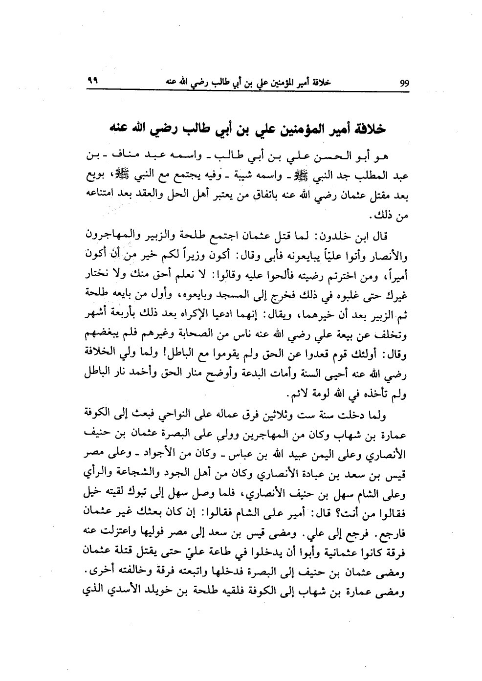 قَالَ ابْن خلدون لما قتل عُثْمَان اجْتمع طَلْحَة وَالزُّبَيْر والمهاجرون وَالْأَنْصَار وَأتوا عليا يبايعونه فَأبى وَقَالَ أكون وزيرا لكم خير من أَن أكون أَمِيرا وَمن اخترتم رضيته فألحوا عَلَيْهِ وَقَالُوا لَا نعلم أَحَق مِنْك وَلَا نَخْتَار غَيْرك حَتَّى غلبوه فِي ذَلِك فَخرج إِلَى الْمَسْجِد وَبَايَعُوهُ وَأول من بَايعه طَلْحَة ثمَّ الزبير بعد أَن خيرهما وَيُقَال أَنَّهُمَا ادّعَيَا الْإِكْرَاه بعد ذَلِك بأَرْبعَة أشهر وتخلف عَن بيعَة عَليّ رَضِي الله عَنهُ نَاس من الصَّحَابَة وَغَيرهم فَلم يبغضهم وَقَالَ أُولَئِكَ قوم قعدوا عَن الْحق وَلم يقومُوا مَعَ الْبَاطِل وَلما ولي الْخلَافَة رَضِي الله عَنهُ أحيى السّنة وأمات الْبِدْعَة وأوضح منار الْحق وأخمد نَار الْبَاطِل وَلم تَأْخُذهُ فِي الله لومة لائم