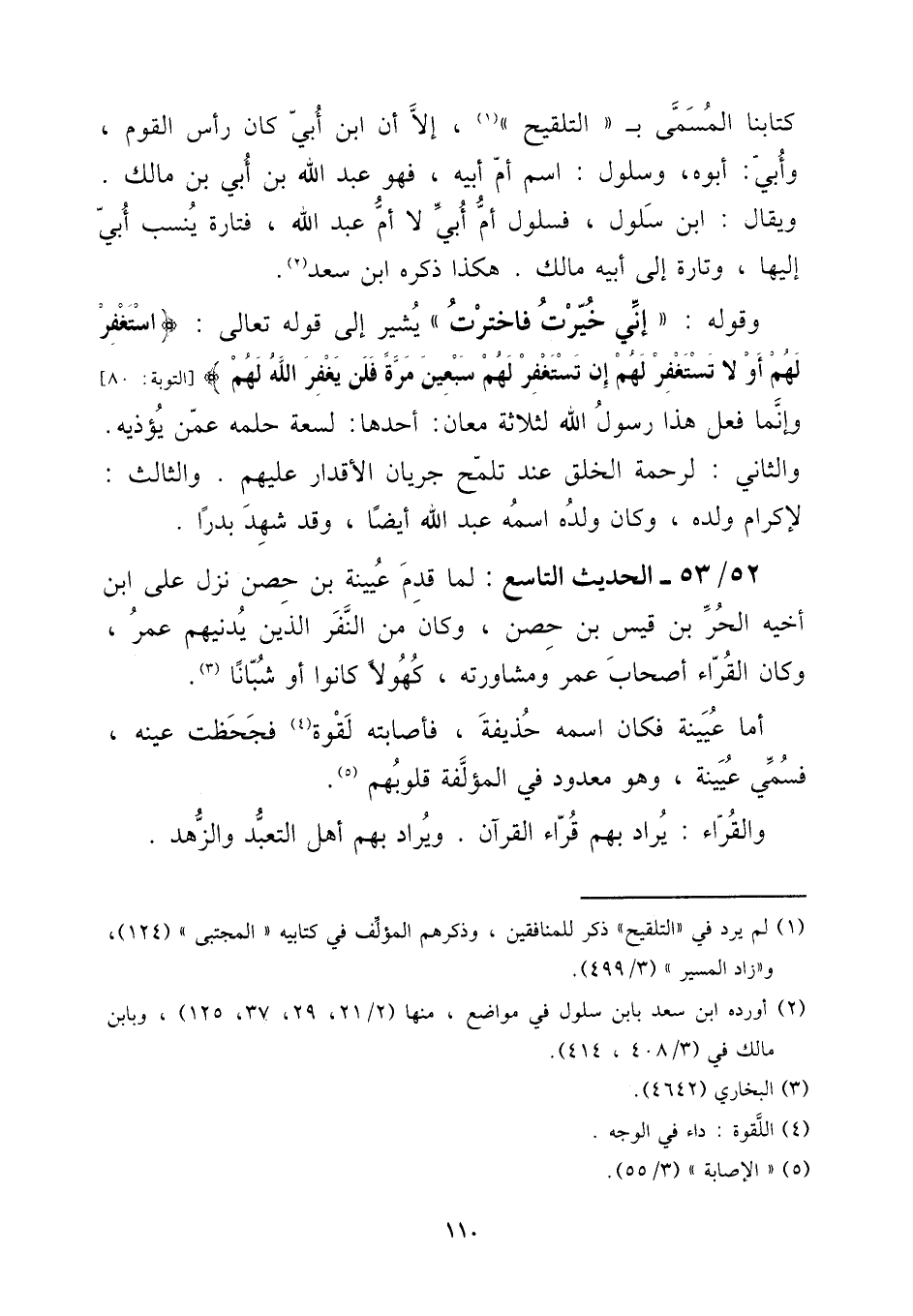 كتَابنَا الْمُسَمّى ب " التلقيح "، إِلَّا أَن ابْن أبي كَانَ رَأس الْقَوْم، وَأبي: أَبوهُ، وسلول: اسْم أم أَبِيه، فَهُوَ عبد الله بن أبي بن مَالك. وَيُقَال: ابْن سلول، فسلول أم أبي لَا أم عبد الله، فَتَارَة ينْسب أبي إِلَيْهَا، وَتارَة إِلَى أَبِيه مَالك. هَكَذَا ذكره ابْن سعد.