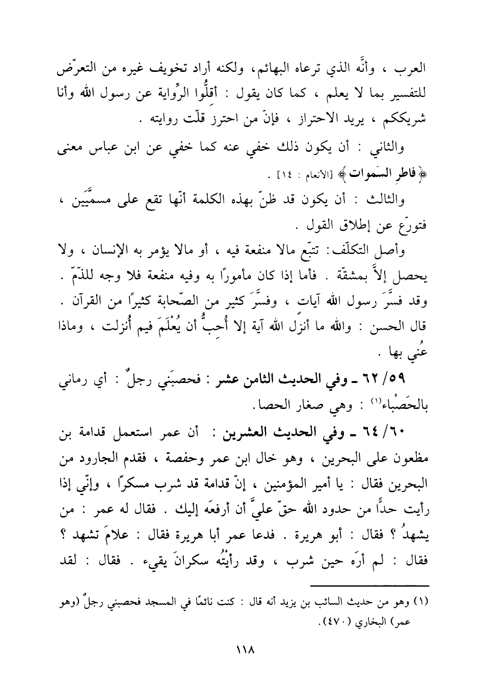 59 - / 62 - وَفِي الحَدِيث الثَّامِن عشر: فحصبني رجل: أَي رماني بالحصباء: وَهِي صغَار الْحَصَا.