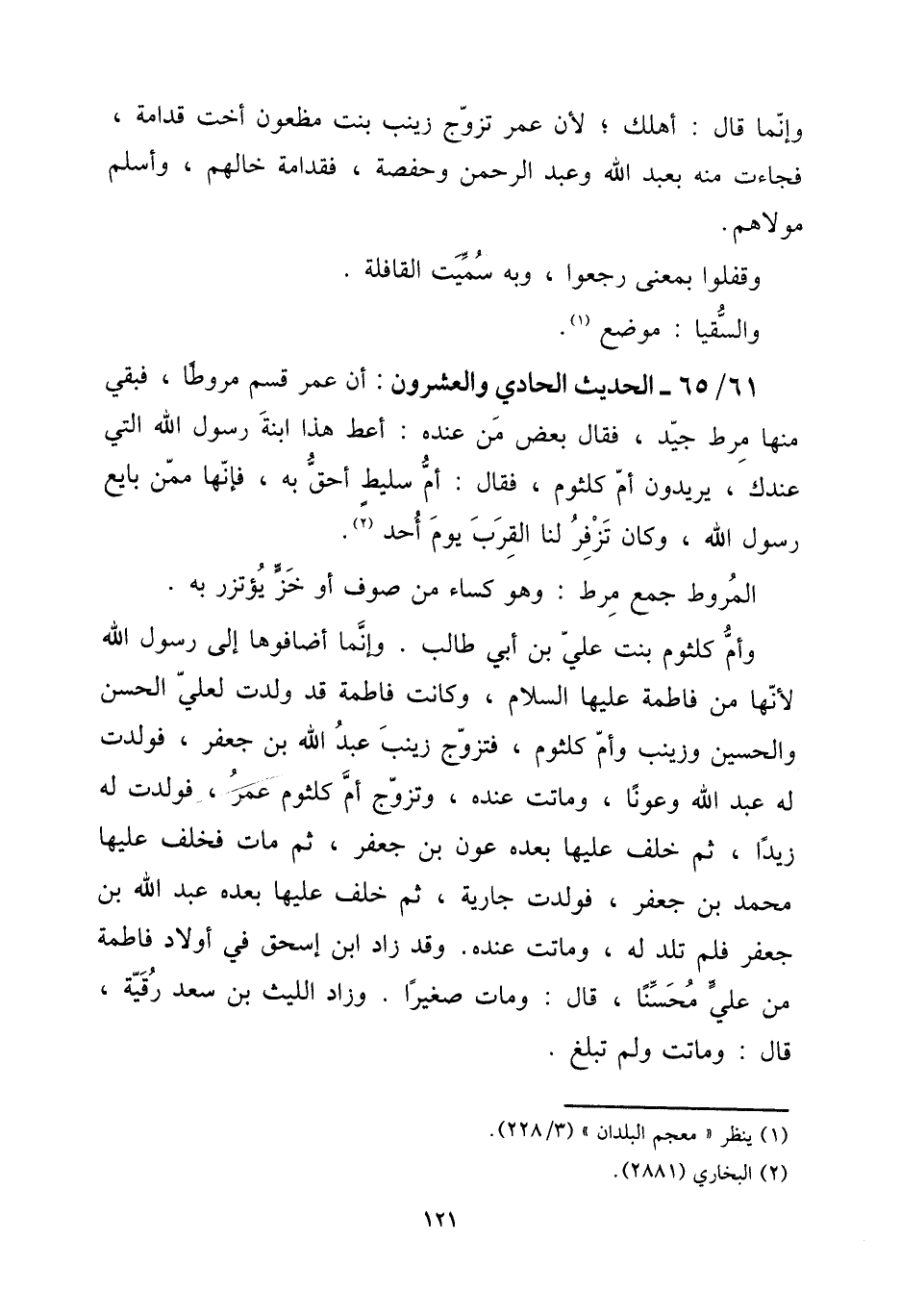 61 - / 65 - الحَدِيث الْحَادِي وَالْعشْرُونَ: أَن عمر قسم مروطا، فَبَقيَ مِنْهَا مرط جيد، فَقَالَ بعض من عِنْده: أعْط هَذَا ابْنة رَسُول الله الَّتِي عنْدك، يُرِيدُونَ أم كُلْثُوم، فَقَالَ: أم سليط أَحَق بِهِ، فَإِنَّهَا مِمَّن بَايع رَسُول الله، وَكَانَ تزفر لنا الْقرب يَوْم أحد.