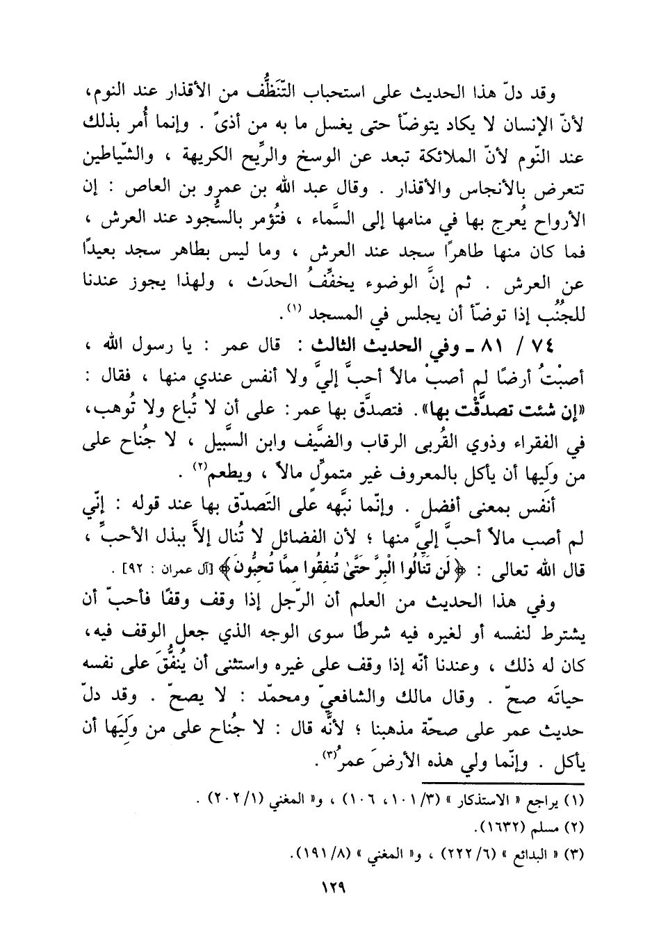 74 - / 81 - وَفِي الحَدِيث الثَّالِث: قَالَ عمر: يَا رَسُول الله، أصبت أَرضًا لم أصب مَالا أحب إِلَيّ وَلَا أنفس عِنْدِي مِنْهَا، فَقَالَ: " إِن شِئْت تَصَدَّقت بهَا ". فَتصدق بهَا عمر: على أَن لَا تبَاع وَلَا توهب، فِي الْفُقَرَاء وَذَوي الْقُرْبَى الرّقاب والضيف وَابْن السَّبِيل، لَا جنَاح على من وَليهَا أَن يَأْكُل بِالْمَعْرُوفِ غير مُتَمَوّل مَالا، وَيطْعم.