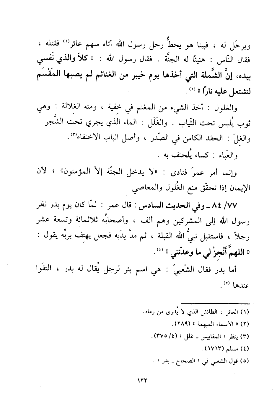 ويرحل لَهُ، فَبينا هُوَ يحط رَحل رَسُول الله أَتَاهُ سهم عائر فَقتله، فَقَالَ النَّاس: هَنِيئًا لَهُ الْجنَّة. فَقَالَ رَسُول الله: " كلا وَالَّذِي نَفسِي بِيَدِهِ، إِن الشملة الَّتِي أَخذهَا يَوْم خَيْبَر من الْغَنَائِم لم يصبهَا الْمقسم لتشتعل عَلَيْهِ نَارا ".