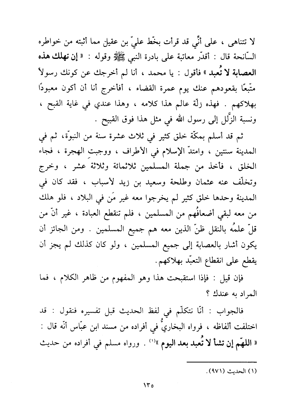 ثمَّ قد أسلم بِمَكَّة خلق كثير فِي ثَلَاث عشرَة سنة من النُّبُوَّة، ثمَّ فِي الْمَدِينَة سنتَيْن، وامتد الْإِسْلَام فِي الْأَطْرَاف، وَوَجَبَت الْهِجْرَة، فجَاء الْخلق، فَأخذ من جملَة الْمُسلمين ثَلَاثمِائَة وَثَلَاثَة عشر، وَخرج وتخلف عَنهُ عُثْمَان وَطَلْحَة وَسَعِيد بن زيد لأسباب، فقد كَانَ فِي الْمَدِينَة وَحدهَا خلق كثير لم يخرجُوا مَعَه غير من فِي الْبِلَاد، فَلَو هلك من مَعَه لبقي أضعافهم من الْمُسلمين، فَلم تَنْقَطِع الْعِبَادَة، غير أَن من قل علمه بِالنَّقْلِ ظن الَّذين مَعَه هم جَمِيع الْمُسلمين. وَمن الْجَائِز أَن يكون أَشَارَ بِالْعِصَابَةِ إِلَى جَمِيع الْمُسلمين، وَلَو كَانَ كَذَلِك لم يجز أَن يقطع على انْقِطَاع التَّعَبُّد بهلاكهم.