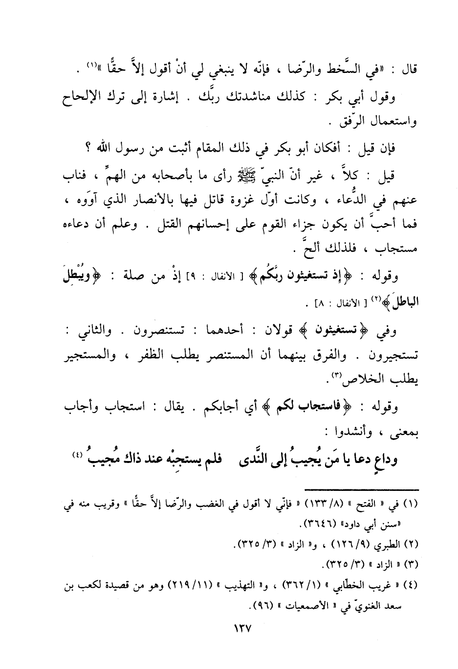 قيل: كلا، غير أَن النَّبِي صلى الله عَلَيْهِ وَسلم رأى مَا بِأَصْحَابِهِ من الْهم، فناب عَنْهُم فِي الدُّعَاء، وَكَانَت أول غَزْوَة قَاتل فِيهَا بالأنصار الَّذِي آووه، فَمَا أحب أَن يكون جَزَاء الْقَوْم على إحسانهم الْقَتْل. وَعلم أَن دعاءه مستجاب، فَلذَلِك ألح.