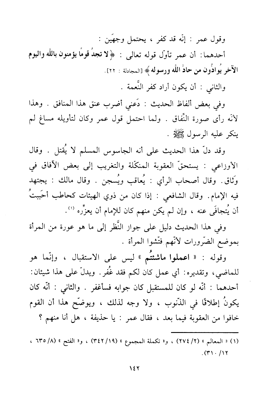 وَفِي بعض أَلْفَاظ الحَدِيث: دَعْنِي أضْرب عنق هَذَا الْمُنَافِق. وَهَذَا لِأَنَّهُ رأى صُورَة النِّفَاق. وَلما احْتمل قَول عمر وَكَانَ لتأويله مساغ لم يُنكر عَلَيْهِ الرَّسُول صلى الله عَلَيْهِ وَسلم.