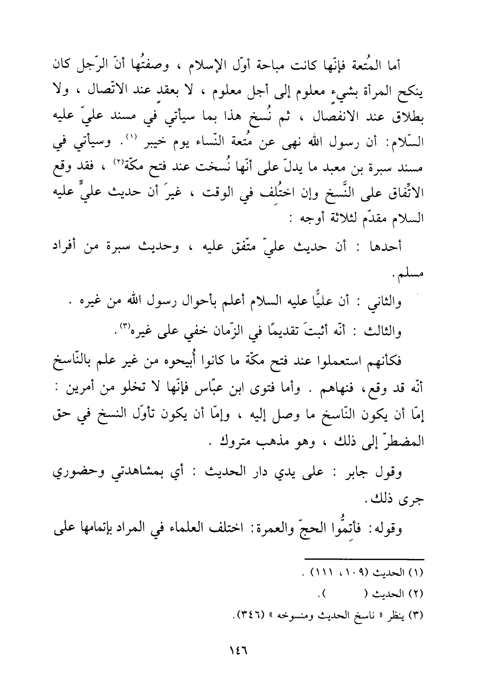 أما الْمُتْعَة فَإِنَّهَا كَانَت مُبَاحَة أول الْإِسْلَام، وصفتها أَن الرجل كَانَ ينْكح الْمَرْأَة بِشَيْء مَعْلُوم إِلَى أجل مَعْلُوم، لَا بِعقد عِنْد الِاتِّصَال، وَلَا بِطَلَاق عِنْد الِانْفِصَال، ثمَّ نسخ هَذَا بِمَا سَيَأْتِي فِي مُسْند عَليّ عَلَيْهِ السَّلَام: أَن رَسُول الله نهى عَن مُتْعَة النِّسَاء يَوْم خَيْبَر. وَسَيَأْتِي فِي مُسْند سُبْرَة بن معبد مَا يدل على أَنَّهَا نسخت عِنْد فتح مَكَّة، فقد وَقع الِاتِّفَاق على النّسخ وَإِن اخْتلف فِي الْوَقْت، غير أَن حَدِيث عَليّ عَلَيْهِ السَّلَام مقدم لثَلَاثَة أوجه: