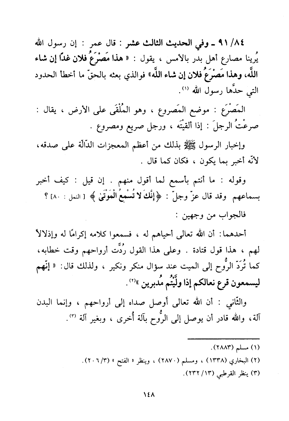 84 - / 91 - وَفِي الحَدِيث الثَّالِث عشر: قَالَ عمر: إِن رَسُول الله يرينا مصَارِع أهل بدر بالْأَمْس، يَقُول: " هَذَا مصرع فلَان غَدا إِن شَاءَ الله، وَهَذَا مصرع فلَان إِن شَاءَ الله " فو الَّذِي بَعثه بِالْحَقِّ مَا أَخطَأ الْحُدُود الَّتِي حَدهَا رَسُول الله.