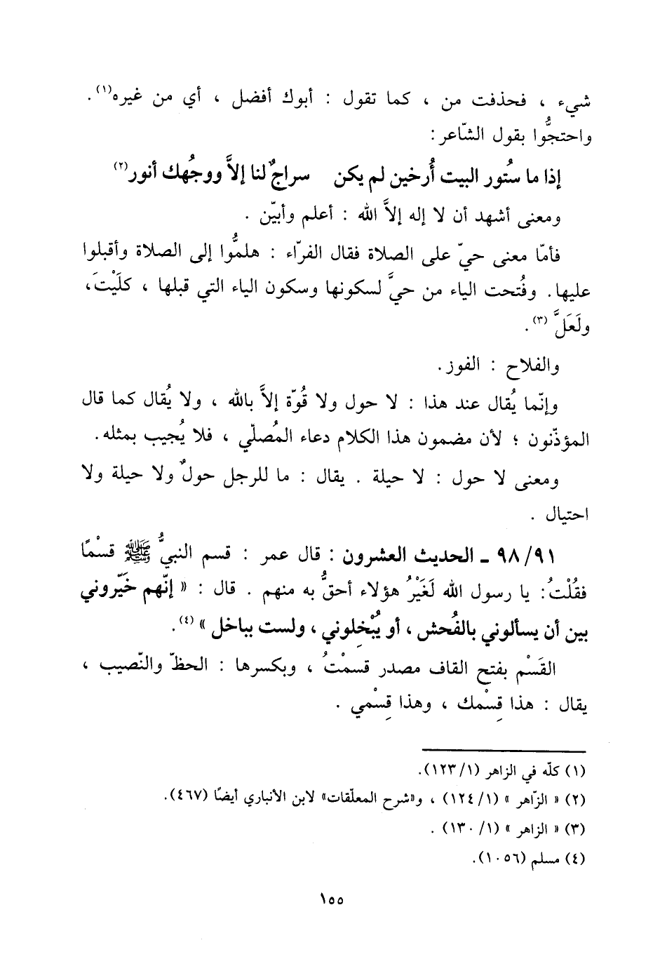 91 - / 98 - الحَدِيث الْعشْرُونَ: قَالَ عمر: قسم النَّبِي صلى الله عَلَيْهِ وَسلم قسما فَقلت: يَا رَسُول الله لغير هَؤُلَاءِ أَحَق بِهِ مِنْهُم. قَالَ: " إِنَّهُم خيروني بَين أَن يَسْأَلُونِي بالفحش، أَو يبخلوني، وَلست بباخل ".