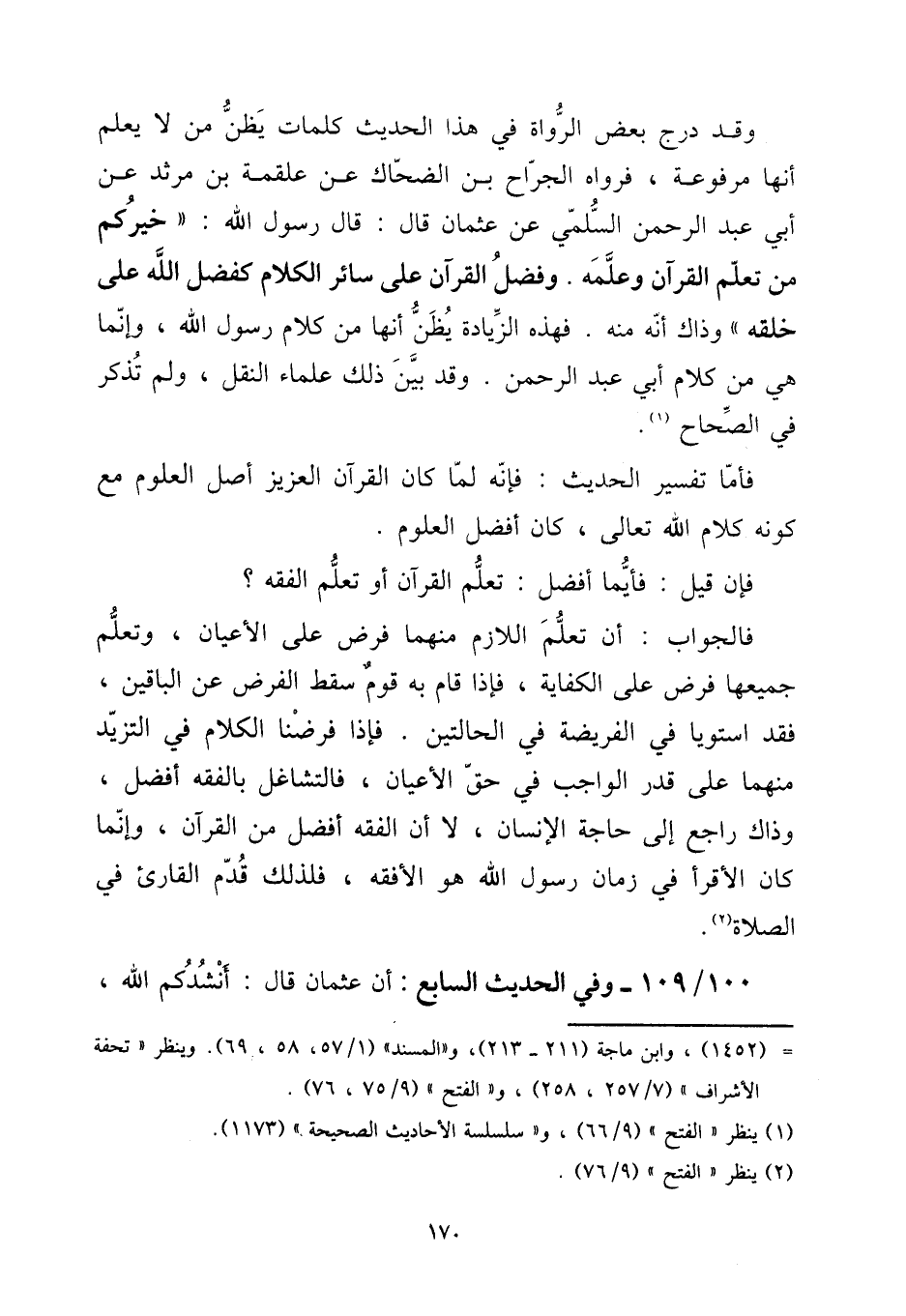 100 - / 109 - وَفِي الحَدِيث السَّابِع: أَن عُثْمَان قَالَ: أنْشدكُمْ الله،