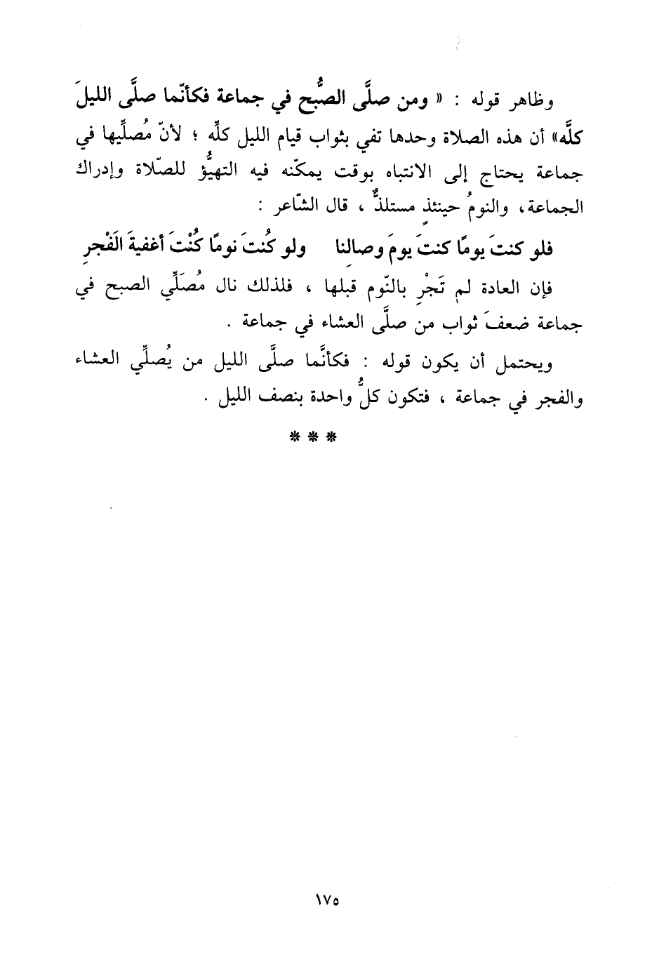 وَظَاهر قَوْله: " وَمن صلى الصُّبْح فِي جمَاعَة فَكَأَنَّمَا صلى اللَّيْل كُله " أَن هَذِه الصَّلَاة وَحدهَا تفي بِثَوَاب قيام اللَّيْل كُله؛ لِأَن مصليها فِي جمَاعَة يحْتَاج إِلَى الانتباه بِوَقْت يُمكنهُ فِيهِ التهيؤ للصَّلَاة وَإِدْرَاك الْجَمَاعَة، وَالنَّوْم حِينَئِذٍ مستلذ، قَالَ الشَّاعِر: