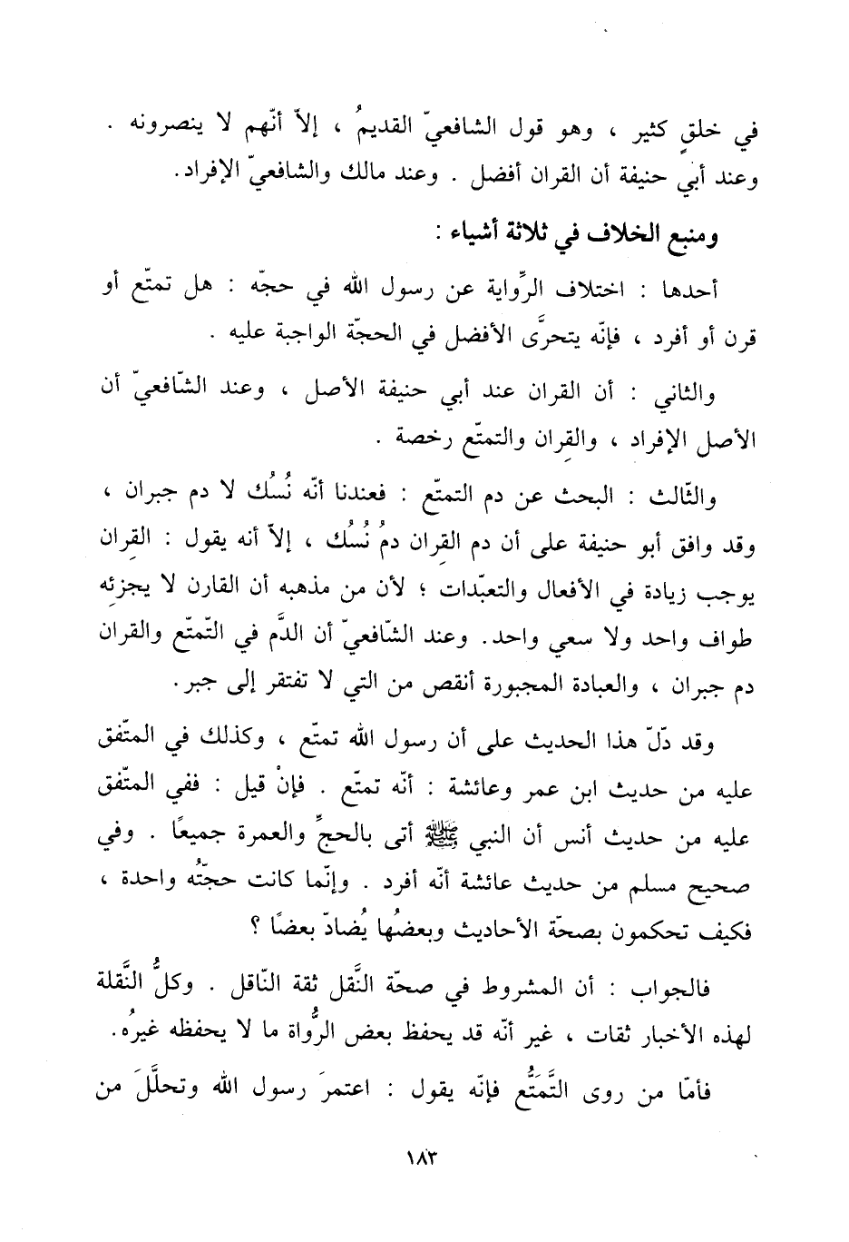 وَالثَّالِث: الْبَحْث عَن دم التَّمَتُّع: فعندنا أَنه نسك لَا دم جبران، وَقد وَافق أَبُو حنيفَة على أَن دم الْقرَان دم نسك، إِلَّا أَنه يَقُول: الْقرَان يُوجب زِيَادَة فِي الْأَفْعَال والتعبدات؛ لِأَن من مذْهبه أَن الْقَارِن لَا يُجزئهُ طواف وَاحِد وَلَا سعي وَاحِد. وَعند الشَّافِعِي أَن الدَّم فِي التَّمَتُّع وَالْقرَان دم جبران، وَالْعِبَادَة المجبورة أنقص من الَّتِي لَا تفْتَقر إِلَى جبر.