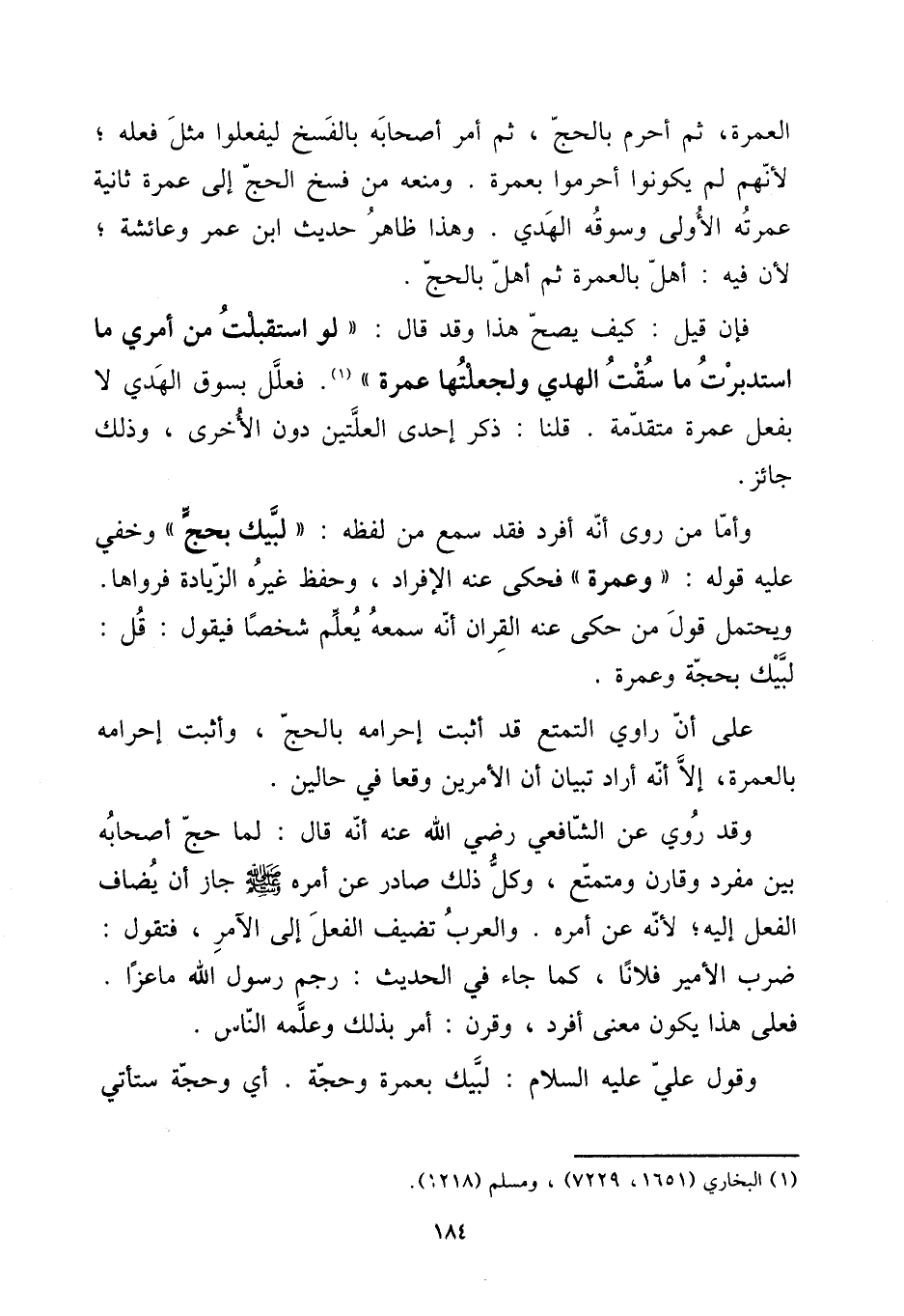 وَقد رُوِيَ عَن الشَّافِعِي رَضِي الله عَنهُ أَنه قَالَ: لما حج أَصْحَابه بَين مُفْرد وقارن ومتمتع، وكل ذَلِك صادر عَن أمره صلى الله عَلَيْهِ وَسلم جَازَ أَن يُضَاف الْفِعْل إِلَيْهِ؛ لِأَنَّهُ عَن أمره. وَالْعرب تضيف الْفِعْل إِلَى الْآمِر، فَتَقول: ضرب الْأَمِير فلَانا، كَمَا جَاءَ فِي الحَدِيث: رجم رَسُول الله ماعزا. فعلى هَذَا يكون معنى أفرد، وَقرن: أَمر بذلك وَعلمه النَّاس.