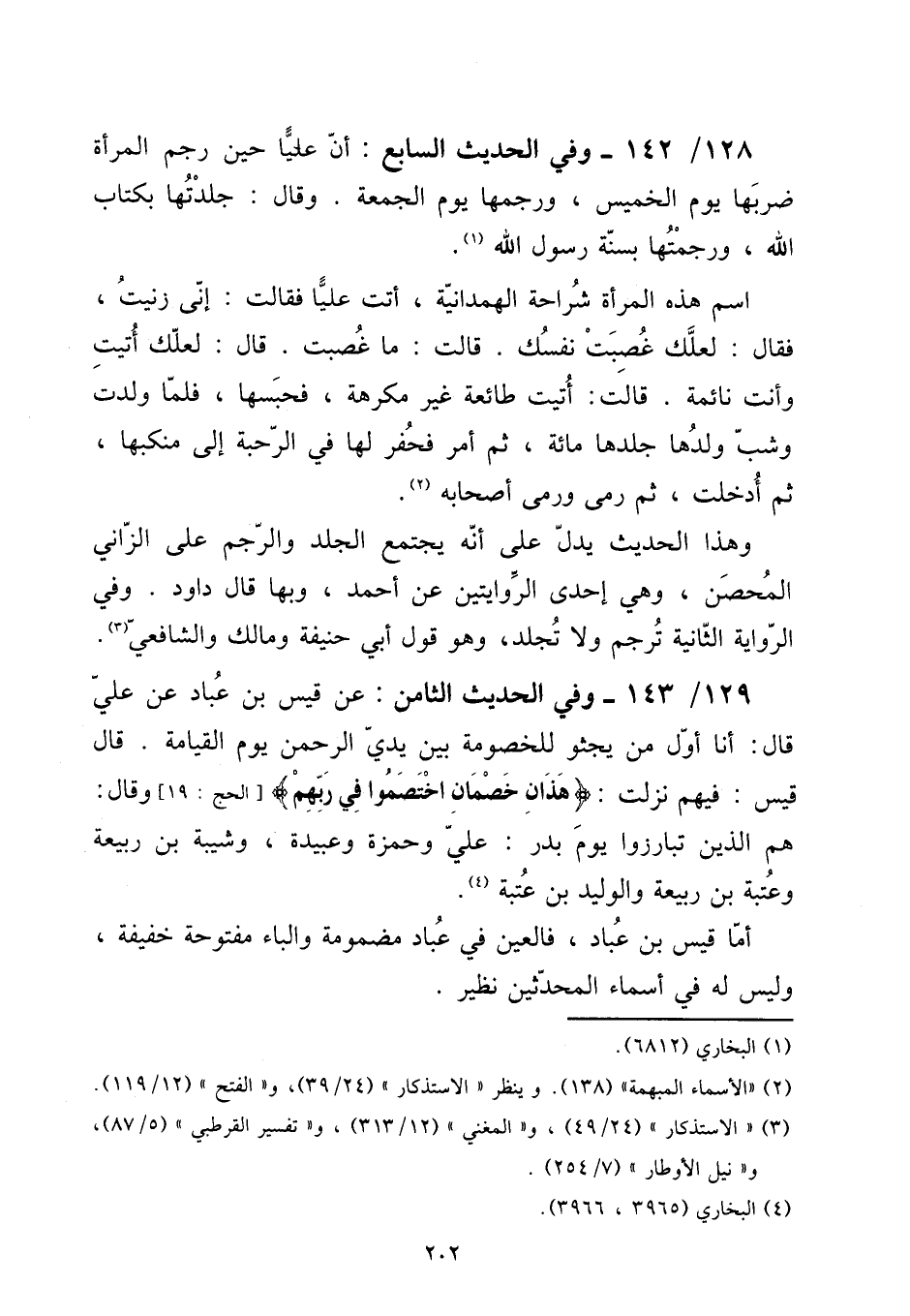 129 - / 143 - وَفِي الحَدِيث الثَّامِن: عَن قيس بن عباد عَن عَليّ قَالَ: أَنا أول من يجثو للخصومة بَين يَدي الرَّحْمَن يَوْم الْقِيَامَة. قَالَ قيس: فيهم نزلت: {هَذَانِ خصمان اخْتَصَمُوا فِي رَبهم} [الْحَج: 19] وَقَالَ: هم الَّذين تبارزوا يَوْم بدر: عَليّ وَحَمْزَة وَعبيدَة، وَشَيْبَة بن ربيعَة وَعتبَة بن ربيعَة والوليد بن عتبَة.