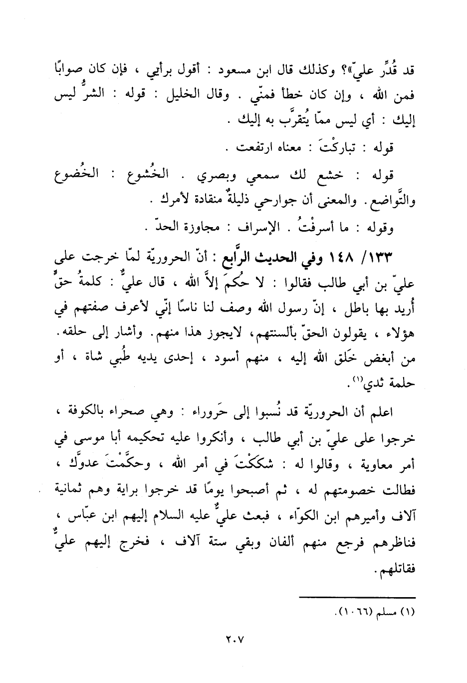 133 - / 148 - وَفِي الحَدِيث الرَّابِع: أَن الحرورية لما خرجت على عَليّ بن أبي طَالب فَقَالُوا: لَا حكم إِلَّا الله، قَالَ عَليّ: كلمة حق أُرِيد بهَا بَاطِل، إِن رَسُول الله وصف لنا نَاسا إِنِّي لأعرف صفتهمْ فِي هَؤُلَاءِ، يَقُولُونَ الْحق بألسنتهم، لَا يجوز هَذَا مِنْهُم. وَأَشَارَ إِلَى حلقه. من أبْغض خلق الله إِلَيْهِ، مِنْهُم أسود، إِحْدَى يَدَيْهِ طبي شَاة، أَو حلمة ثدي.