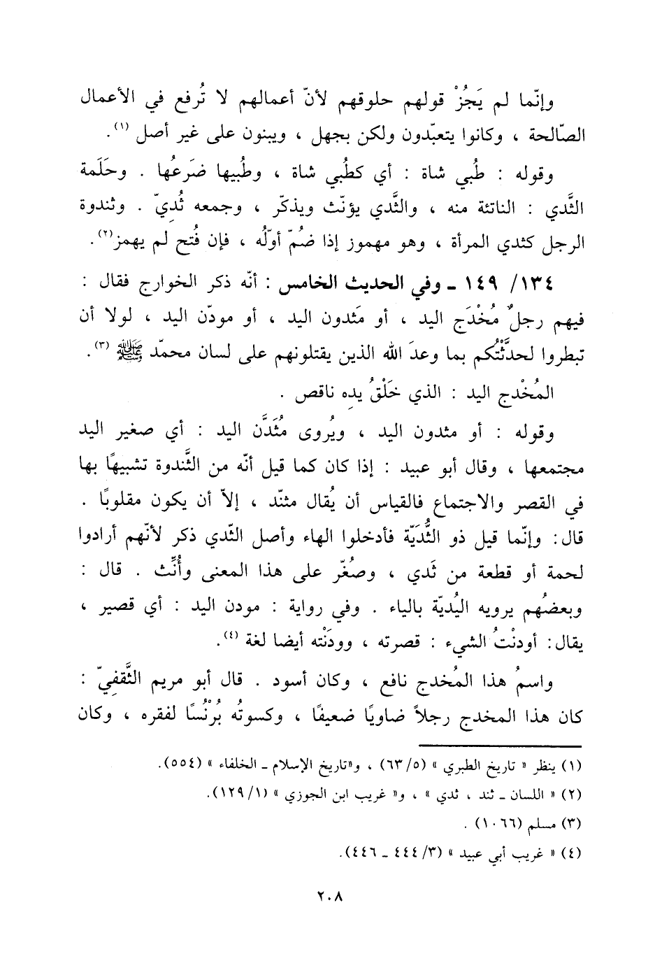 134 - / 149 - وَفِي الحَدِيث الْخَامِس: أَنه ذكر الْخَوَارِج فَقَالَ: فيهم رجل مُخْدج الْيَد، أَو مثدون الْيَد، أَو مودن الْيَد، لَوْلَا أَن تبطروا لحدثتكم بِمَا وعد الله الَّذين يَقْتُلُونَهُمْ على لِسَان مُحَمَّد صلى الله عَلَيْهِ وَسلم.