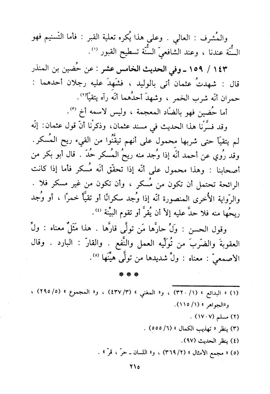 143 - / 159 - وَفِي الحَدِيث الْخَامِس عشر: عَن حضين بن الْمُنْذر قَالَ: شهِدت عُثْمَان أَتَى بالوليد، فَشهد عَلَيْهِ رجلَانِ أَحدهمَا: حمْرَان أَنه شرب الْخمر، وَشهد أَحدهمَا أَنه رَآهُ يتقيأ.