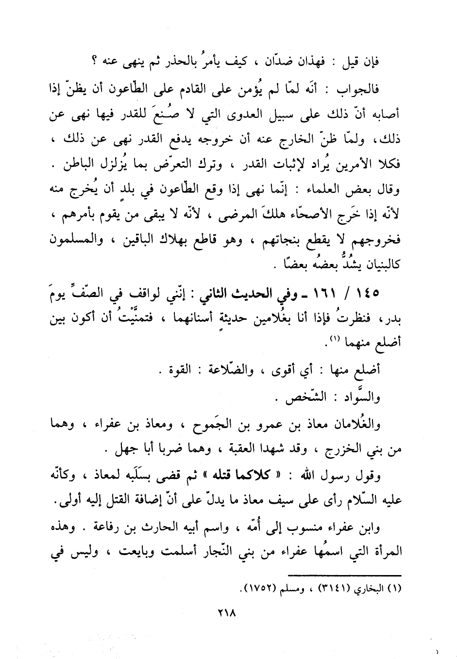 145 - / 161 - وَفِي الحَدِيث الثَّانِي: إِنَّنِي لواقف فِي الصَّفّ يَوْم بدر، فَنَظَرت فَإِذا أَنا بغلامين حَدِيثَة أسنانهما، فتمنيت أَن أكون بَين أضلع مِنْهُمَا.