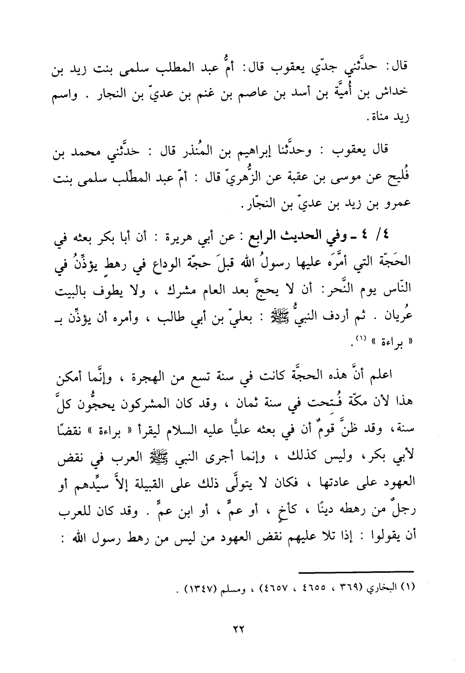 4 - / 4 - وَفِي الحَدِيث الرَّابِع: عَن أبي هُرَيْرَة: أَن أَبَا بكر بَعثه فِي الْحجَّة الَّتِي أمره عَلَيْهَا رَسُول الله قبل حجَّة الْوَدَاع فِي رَهْط يُؤذن فِي النَّاس يَوْم النَّحْر: أَن لَا يحجّ بعد الْعَام مُشْرك، وَلَا يطوف بِالْبَيْتِ عُرْيَان. ثمَّ أرْدف النَّبِي صلى الله عَلَيْهِ وَسلم: بعلي بن أبي طَالب، وَأمره أَن يُؤذن ب " بَرَاءَة ".