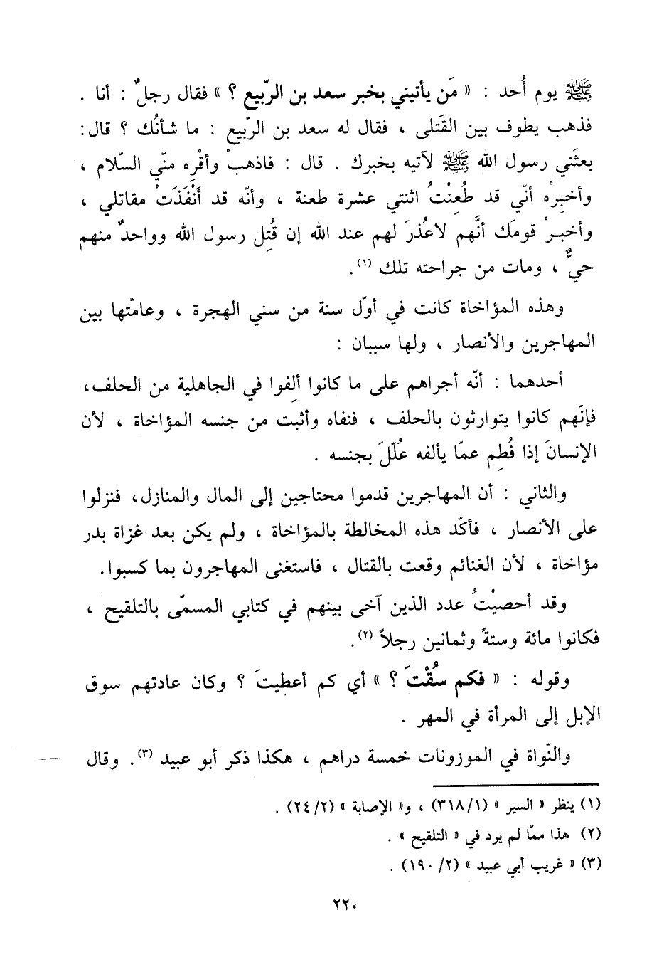 صلى الله عَلَيْهِ وَسلم يَوْم أحد: " من يأتيني بِخَبَر سعد بن الرّبيع؟ " فَقَالَ رجل: أَنا فَذهب يطوف بَين الْقَتْلَى، فَقَالَ لَهُ سعد بن الرّبيع: مَا شَأْنك؟ قَالَ: بَعَثَنِي رَسُول الله صلى الله عَلَيْهِ وَسلم لآتيه بخبرك. قَالَ: فَاذْهَبْ وَأقرهُ مني السَّلَام، وَأخْبرهُ أَنِّي قد طعنت اثْنَتَيْ عشرَة طعنة، وَأَنه قد أنفذت مقاتلي، وَأخْبر قَوْمك أَنهم لَا عذر لَهُم عِنْد الله إِن قتل رَسُول الله وَوَاحِد مِنْهُم حَيّ، وَمَات من جراحته تِلْكَ.