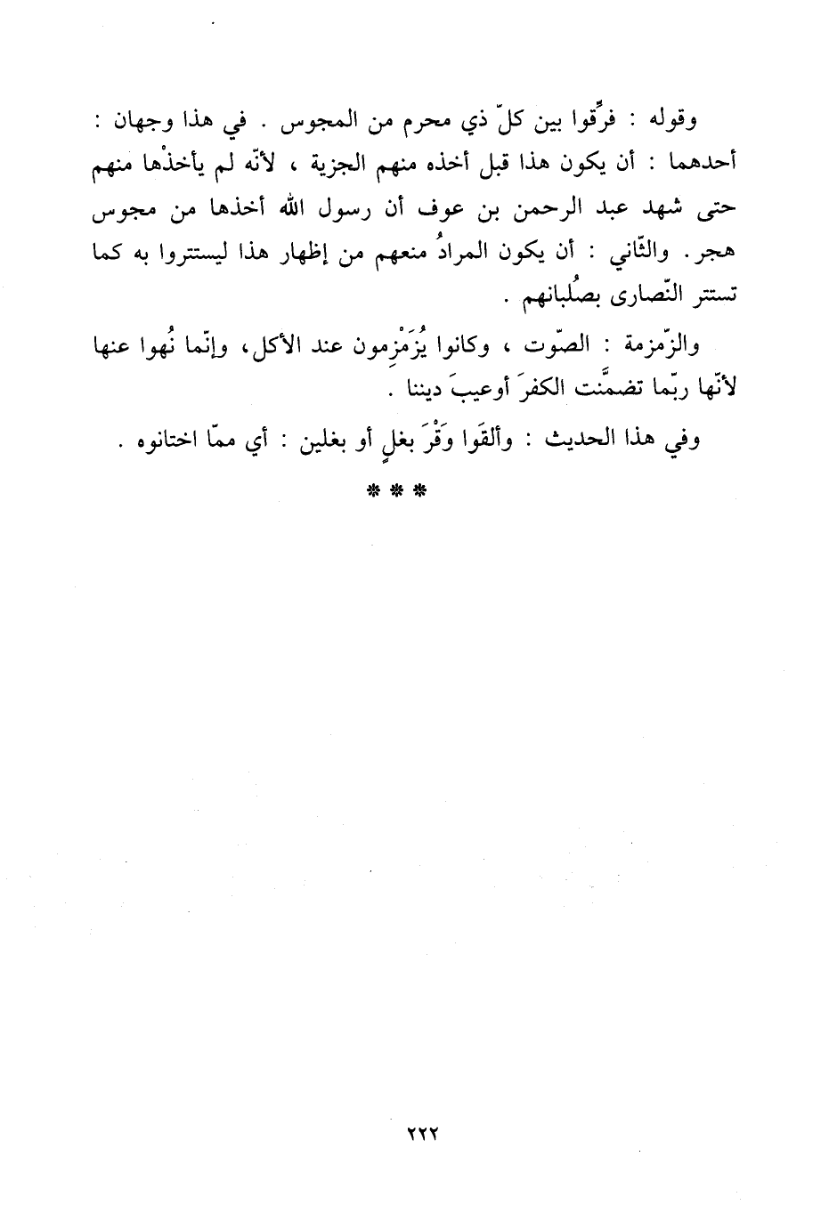 وَقَوله: فرقوا بَين كل ذِي محرم من الْمَجُوس. فِي هَذَا وَجْهَان: أَحدهمَا: أَن يكون هَذَا قبل أَخذه مِنْهُم الْجِزْيَة، لِأَنَّهُ لم يَأْخُذهَا مِنْهُم حَتَّى شهد عبد الرَّحْمَن بن عَوْف أَن رَسُول الله أَخذهَا من مجوس هجر. وَالثَّانِي: أَن يكون المُرَاد مَنعهم من إِظْهَار هَذَا ليستتروا بِهِ كَمَا تستتر النَّصَارَى بصلبانهم.