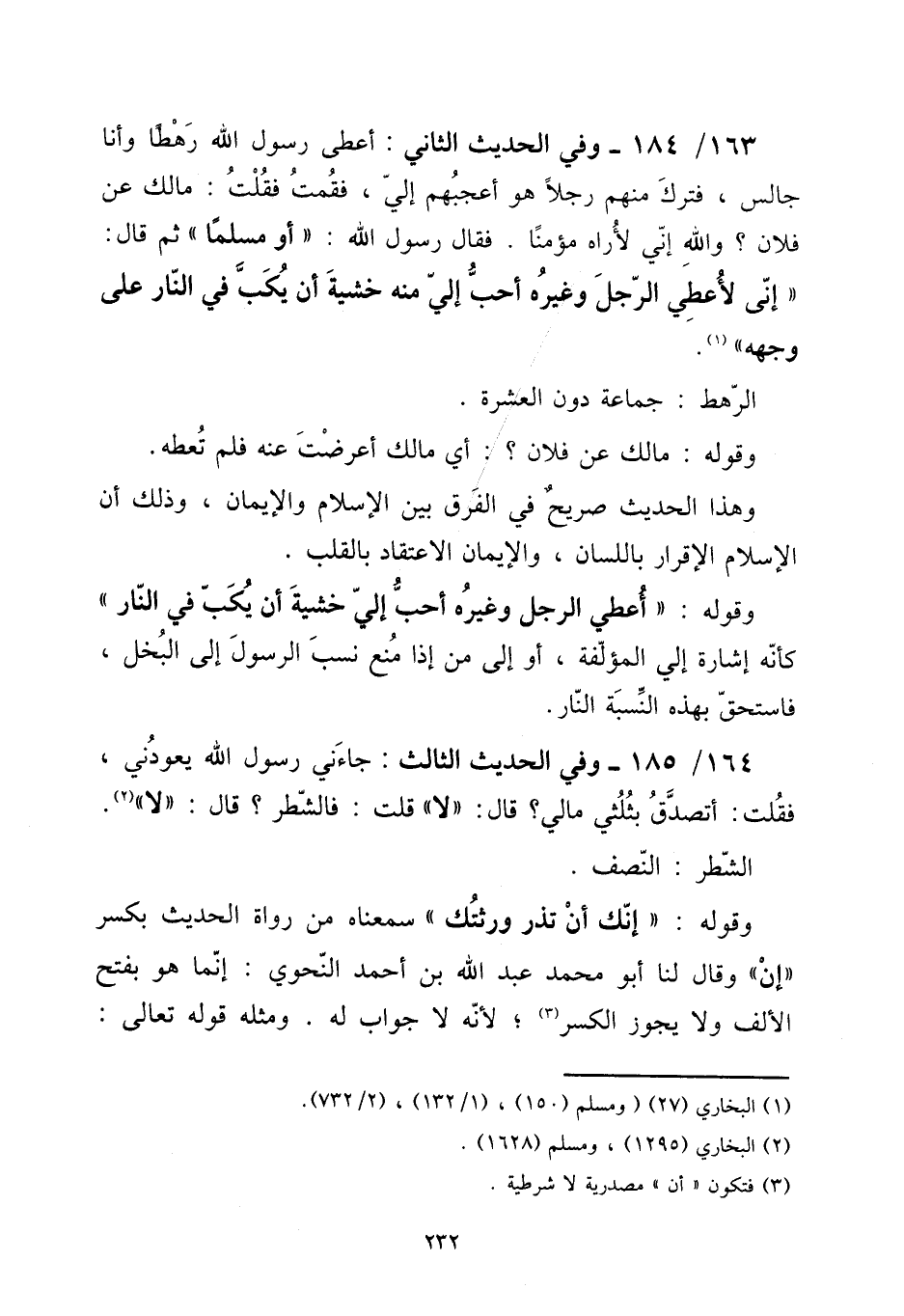 163 - / 184 - وَفِي الحَدِيث الثَّانِي: أعْطى رَسُول الله رهطا وَأَنا جَالس، فَترك مِنْهُم رجلا هُوَ أعجبهم إِلَيّ، فَقُمْت فَقلت: مَالك عَن فلَان؟ وَالله إِنِّي لأراه مُؤمنا. فَقَالَ رَسُول الله: " أَو مُسلما " ثمَّ قَالَ: " إِنِّي لأعطي الرجل وَغَيره أحب إِلَيّ مِنْهُ خشيَة أَن يكب فِي النَّار على وَجهه ".