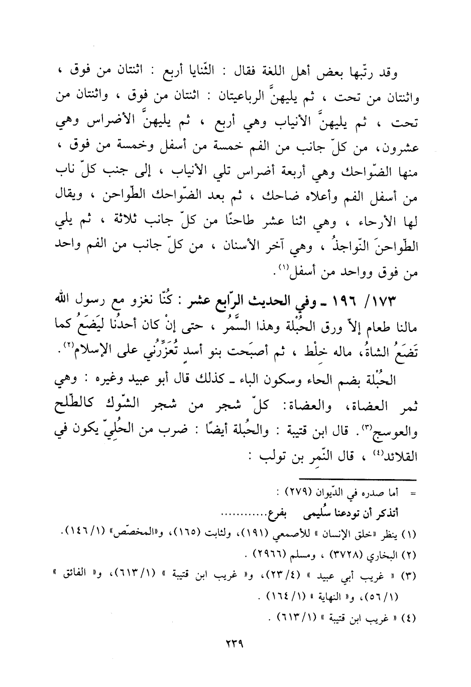 173 - / 196 - وَفِي الحَدِيث الرَّابِع عشر: كُنَّا نغزو مَعَ رَسُول الله مالنا طَعَام إِلَّا ورق الحبلة وَهَذَا السمر، حَتَّى إِن كَانَ أَحَدنَا ليضع كَمَا تضع الشَّاة، مَاله خلط، ثمَّ أَصبَحت بَنو أَسد تعزرني على الْإِسْلَام.