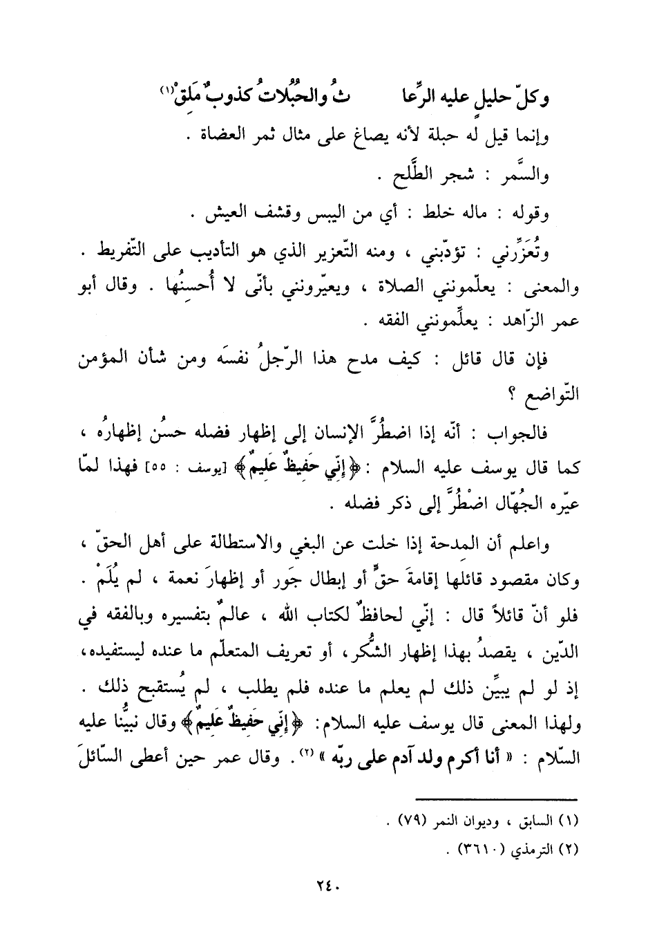 وَاعْلَم أَن المدحة إِذا خلت عَن الْبَغي والاستطالة على أهل الْحق، وَكَانَ مَقْصُود قَائِلهَا إِقَامَة حق أَو إبِْطَال جور أَو إِظْهَار نعْمَة، لم يلم. فَلَو أَن قَائِلا: إِنِّي لحافظ لكتاب الله، عَالم بتفسيره وبالفقه فِي الدّين، يقْصد بِهَذَا إِظْهَار الشُّكْر، أَو تَعْرِيف المتعلم مَا عِنْده ليستفيده، إِذْ لَو لم يبين ذَلِك لم يعلم مَا عِنْده فَلم يطْلب، لم يستقبح ذَلِك. وَلِهَذَا الْمَعْنى قَالَ يُوسُف عَلَيْهِ السَّلَام: {إِنِّي حفيظ عليم} وَقَالَ نَبينَا عَلَيْهِ السَّلَام: " أَنا أكْرم ولد آدم على ربه ". وَقَالَ عمر حِين أعْطى السَّائِل
