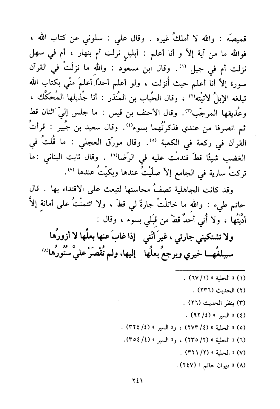 قَمِيصه: وَالله لَا أملك غَيره. وَقَالَ عَليّ: سلوني عَن كتاب الله، فو الله مَا من آيَة إِلَّا وَأَنا أعلم: أبليل نزلت أم بنهار، أم فِي سهل نزلت أم فِي جبل. وَقَالَ ابْن مَسْعُود: وَالله مَا نزلت فِي الْقُرْآن سُورَة إِلَّا أَنا أعلم حَيْثُ أنزلت، وَلَو أعلم أحدا أعلم مني بِكِتَاب الله تبلغه الْإِبِل لأتيته، وَقَالَ الْحباب بن الْمُنْذر: أَنا جذيلها المحكك، وعذيقها المرجب. وَقَالَ الْأَحْنَف بن قيس: مَا جلس إِلَيّ اثْنَان قطّ ثمَّ انصرفا من عِنْدِي فذكرتهما بِسوء. وَقَالَ سعيد بن جُبَير: قَرَأت الْقُرْآن فِي رَكْعَة فِي الْكَعْبَة. وَقَالَ مُورق الْعجلِيّ: مَا قلت فِي الْغَضَب شَيْئا قطّ فندمت عَلَيْهِ فِي الرِّضَا. وَقَالَ ثَابت الْبنانِيّ: مَا تركت سَارِيَة فِي الْجَامِع إِلَّا صليت عِنْدهَا وبكيت عِنْدهَا.