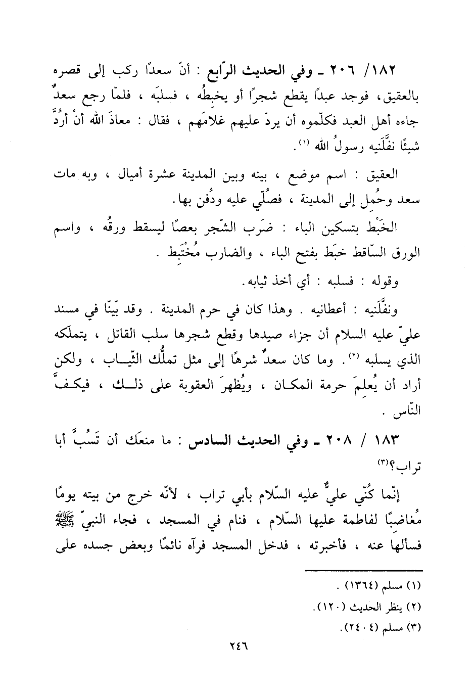 182 - / 206 - وَفِي الحَدِيث الرَّابِع: أَن سَعْدا ركب إِلَى قصره بالعقيق، فَوجدَ عبدا يقطع شَجرا أَو يخبطه، فسلبه، فَلَمَّا رَجَعَ سعد جَاءَهُ أهل العَبْد فكلموه أَن يرد عَلَيْهِم غلامهم، فَقَالَ: معَاذ الله أَن أرد شَيْئا نفلنيه رَسُول الله.