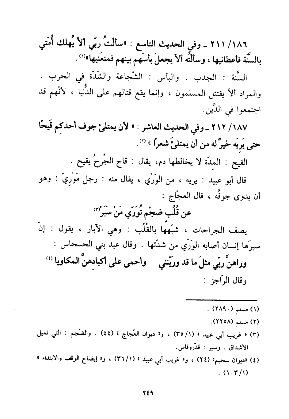 186 - / 211 - وَفِي الحَدِيث التَّاسِع: " سَأَلت رَبِّي أَلا يهْلك أمتِي بِالسنةِ فَأَعْطَانِيهَا، وَسَأَلته أَلا يَجْعَل بأسهم بَينهم فَمَنَعَنِيهَا ".