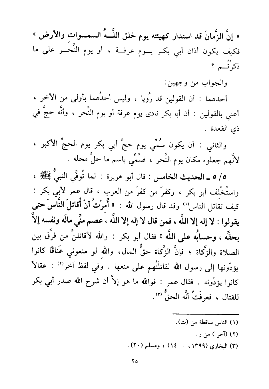 " إِن الزَّمَان قد اسْتَدَارَ كَهَيْئَته يَوْم خلق الله السَّمَوَات وَالْأَرْض " فَكيف يكون أَذَان أبي بكر يَوْم عَرَفَة، أَو يَوْم النَّحْر على مَا ذكرْتُمْ؟