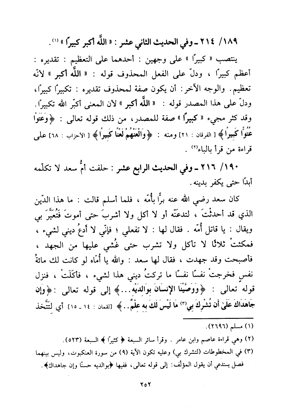 190 - / 216 - وَفِي الحَدِيث الرَّابِع عشر: حَلَفت أم سعد لَا تكَلمه أبدا حَتَّى يكفر بِدِينِهِ.