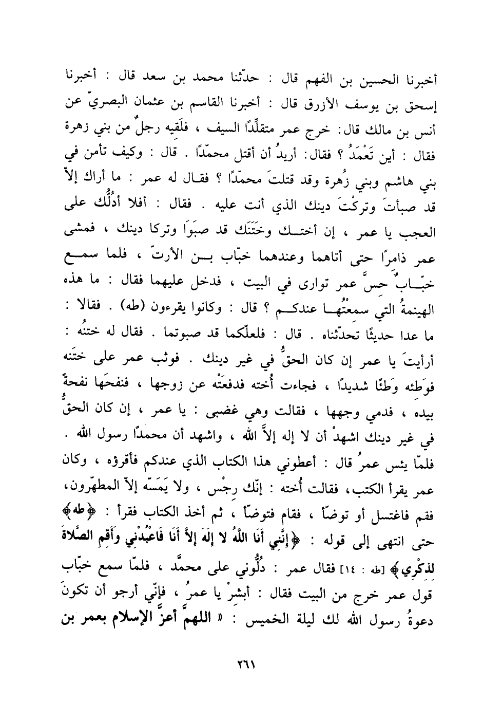 أخبرنَا الْحُسَيْن بن الْفَهم قَالَ: حَدثنَا مُحَمَّد بن سعد قَالَ: أخبرنَا إِسْحَق بن يُوسُف الْأَزْرَق قَالَ: أخبرنَا الْقَاسِم بن عُثْمَان الْبَصْرِيّ عَن أنس بن مَالك قَالَ: خرج عمر مُتَقَلِّدًا السَّيْف، فَلَقِيَهُ رجل من بني زهرَة فَقَالَ: أَيْن تعمد؟ فَقَالَ: أُرِيد أَن أقتل مُحَمَّدًا. قَالَ: وَكَيف تأمن فِي بني هَاشم وَبني زهرَة وَقد قتلت مُحَمَّدًا؟ فَقَالَ لَهُ عمر: مَا أَرَاك إِلَّا قد صَبَأت وَتركت دينك الَّذِي أَنْت عَلَيْهِ. فَقَالَ: أَفلا أدلك على الْعجب يَا عمر، إِن أختك وختنك قد صبوا وتركا دينك، فَمشى عمر ذامرا حَتَّى أتاهما وَعِنْدَهُمَا خباب بن الْأَرَت، فَلَمَّا سمع خباب حس عمر توارى فِي الْبَيْت، فَدخل عَلَيْهِمَا فَقَالَ: مَا هَذِه الهينمة الَّتِي سَمعتهَا عنْدكُمْ؟ قَالَ: وَكَانُوا يقرءُون (طه) . فَقَالَا: مَا عدا حَدِيثا تحدثناه. قَالَ: فلعلكما قد صبوتما. فَقَالَ لَهُ ختنه: أَرَأَيْت يَا عمر إِن كَانَ الْحق فِي غير دينك. فَوَثَبَ عمر على ختنه فوطئه وطئا شَدِيدا، فَجَاءَت أُخْته فَدَفَعته عَن زَوجهَا، فنفحها نفحة بِيَدِهِ، فدمي وَجههَا، فَقَالَت وَهِي غَضبى: يَا عمر، إِن كَانَ الْحق فِي غير دينك اشْهَدْ أَن لَا إِلَه إِلَّا الله، واشهد أَن مُحَمَّدًا رَسُول الله. فَلَمَّا يئس عمر قَالَ: أعطوني هَذَا الْكتاب الَّذِي عنْدكُمْ فأقرؤه، وَكَانَ عمر يقْرَأ الْكتب، فَقَالَت أُخْته: إِنَّك رِجْس، وَلَا يمسهُ إِلَّا الْمُطهرُونَ، فَقُمْ فاغتسل أَو تَوَضَّأ، فَقَامَ فَتَوَضَّأ، ثمَّ أَخذ الْكتاب فَقَرَأَ: {طه} حَتَّى انْتهى إِلَى قَوْله: {إِنَّنِي أَنا الله لَا إِلَه إِلَّا أَنا فاعبدني وأقم الصَّلَاة لذكري} [طه: 14] فَقَالَ عمر: دلوني على مُحَمَّد، فَلَمَّا سمع خباب قَول عمر خرج من الْبَيْت فَقَالَ: أبشر يَا عمر، فَإِنِّي أَرْجُو أَن تكون دَعْوَة رَسُول الله لَك لَيْلَة الْخَمِيس: " اللَّهُمَّ أعز الْإِسْلَام بعمر بن