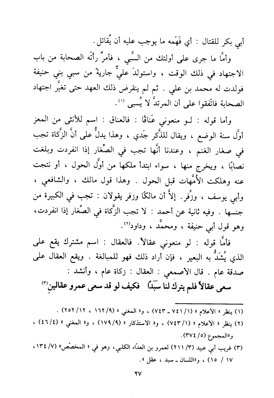 فَأَما قَوْله: لَو مَنَعُونِي عقَالًا. فالعقال: اسْم مُشْتَرك يَقع على الَّذِي يشد بِهِ الْبَعِير، فَإِن أَرَادَ ذَلِك فَهُوَ للْمُبَالَغَة. وَيَقَع العقال على صَدَقَة عَام. قَالَ الْأَصْمَعِي: العقال: زَكَاة عَام، وَأنْشد: