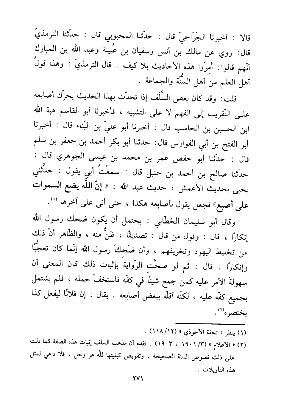 قلت: وَقد كَانَ بعض السّلف إِذا تحدث بِهَذَا الحَدِيث يُحَرك أَصَابِعه على التَّقْرِيب إِلَى الْفَهم لَا على التَّشْبِيه، فَأخْبرنَا أَبُو الْقَاسِم هبة الله ابْن الْحُسَيْن بن الحاسب قَالَ: أخبرنَا أَبُو عَليّ بن الْبناء قَالَ: أخبرنَا أَبُو الْفَتْح بن أبي الفوارس قَالَ: حَدثنَا أَبُو بكر أَحْمد بن جَعْفَر بن سلم قَالَ: حَدثنَا أَبُو حَفْص عمر بن مُحَمَّد بن عِيسَى الْجَوْهَرِي قَالَ: حَدثنَا صَالح بن أَحْمد بن حَنْبَل قَالَ: سَمِعت أبي يَقُول: حَدثنِي يحيى بِحَدِيث الْأَعْمَش، حَدِيث عبد الله: " إِن الله يضع السَّمَوَات على أصْبع " فَجعل يَقُول بأصابعه هَكَذَا، حَتَّى أَتَى على آخرهَا.