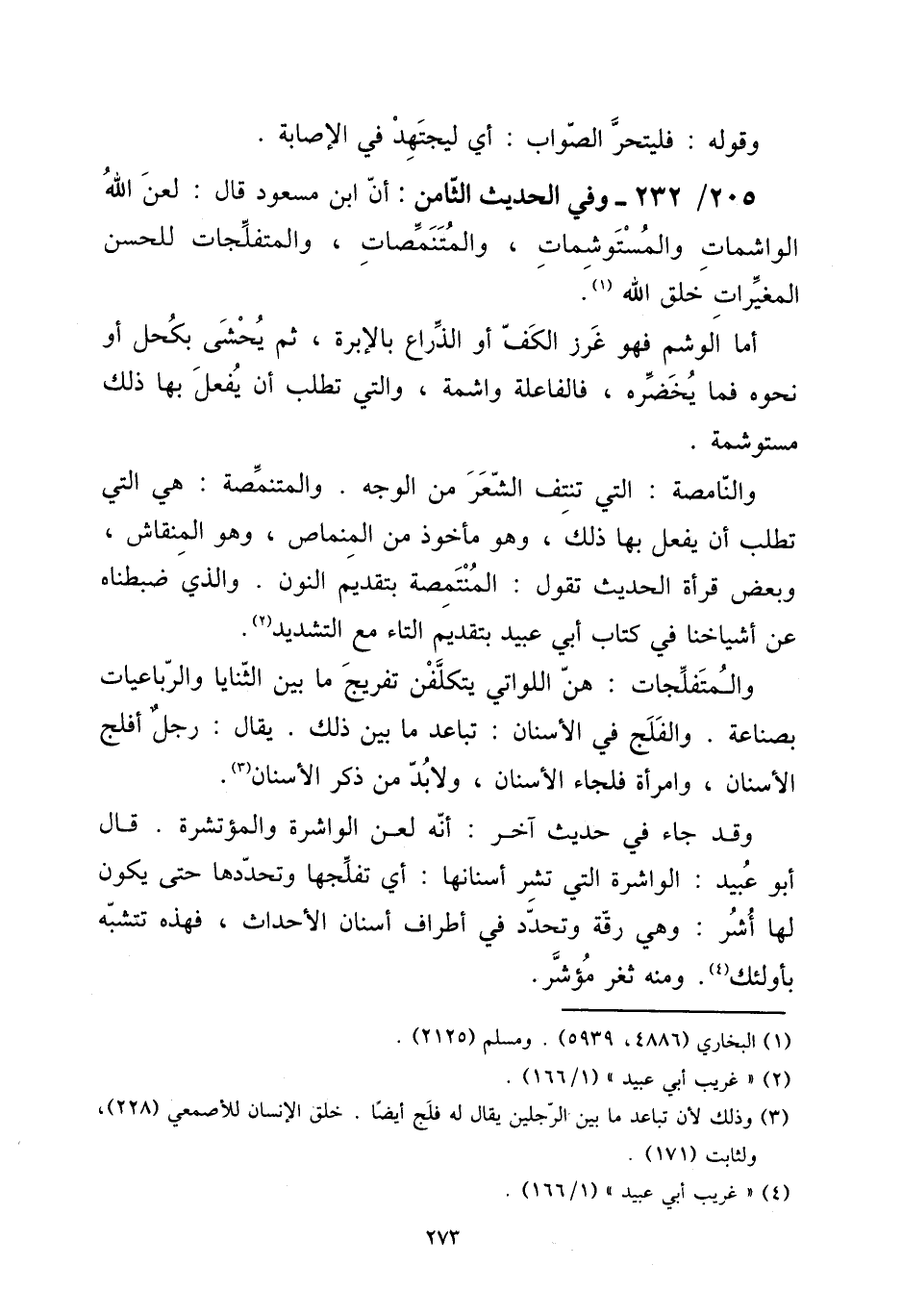 205 - / 232 - وَفِي الحَدِيث الثَّامِن: أَن ابْن مَسْعُود قَالَ: لعن الله الْوَاشِمَات وَالْمُسْتَوْشِمَات، وَالْمُتَنَمِّصَات، وَالْمُتَفَلِّجَات لِلْحسنِ الْمُغيرَات خلق الله.
