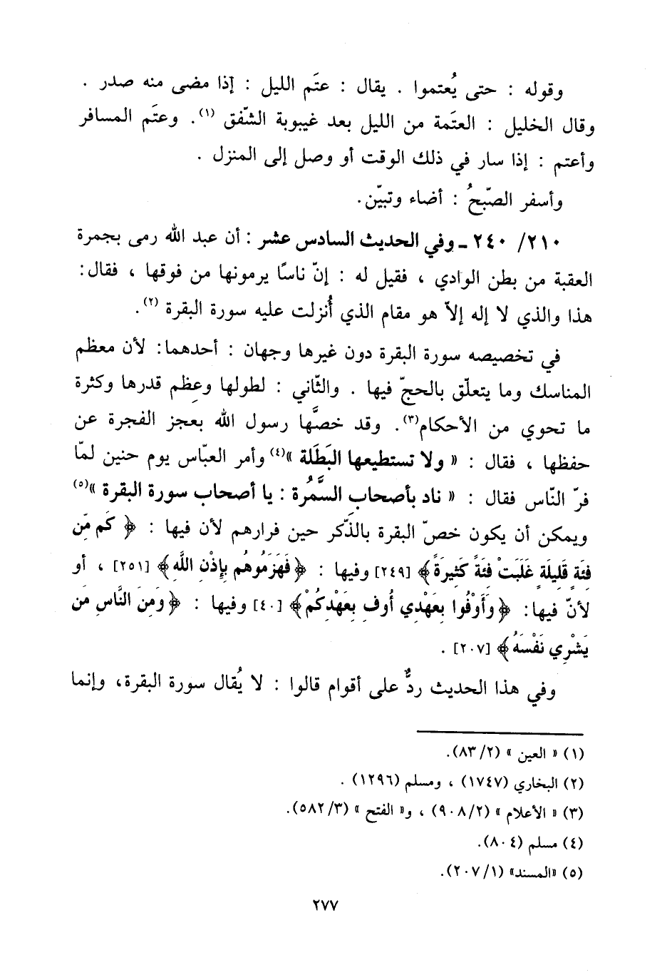 210 - / 240 - وَفِي الحَدِيث السَّادِس عشر: أَن عبد الله رمى بجمرة الْعقبَة من بطن الْوَادي، فَقيل لَهُ: إِن نَاسا يَرْمُونَهَا من فَوْقهَا، فَقَالَ: هَذَا وَالَّذِي لَا إِلَه إِلَّا هُوَ مقَام الَّذِي أنزلت عَلَيْهِ سُورَة الْبَقَرَة.