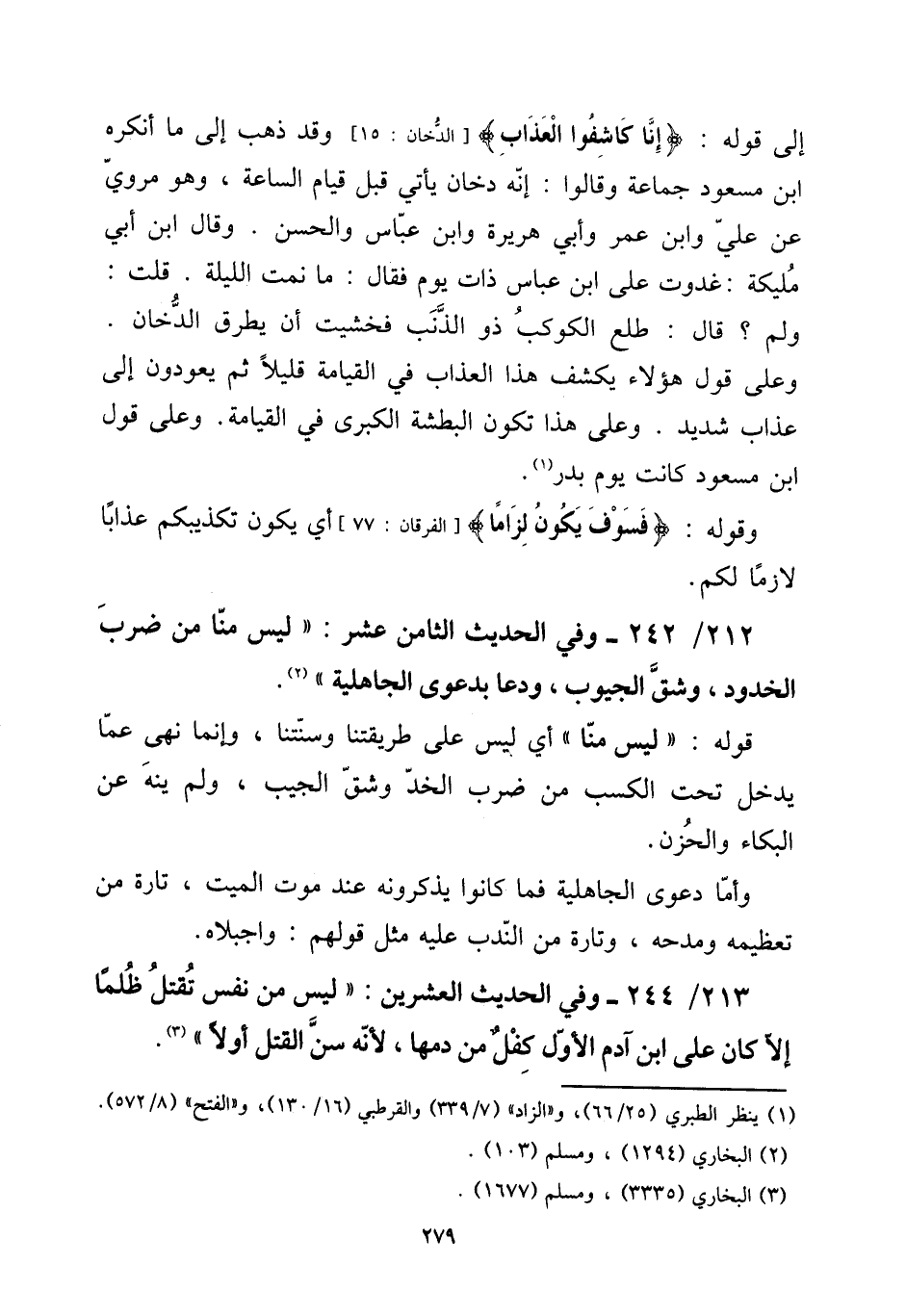 212 - / 242 - وَفِي الحَدِيث الثَّامِن عشر: " لَيْسَ منا من ضرب الخدود، وشق الْجُيُوب، ودعا بِدَعْوَى الْجَاهِلِيَّة ".