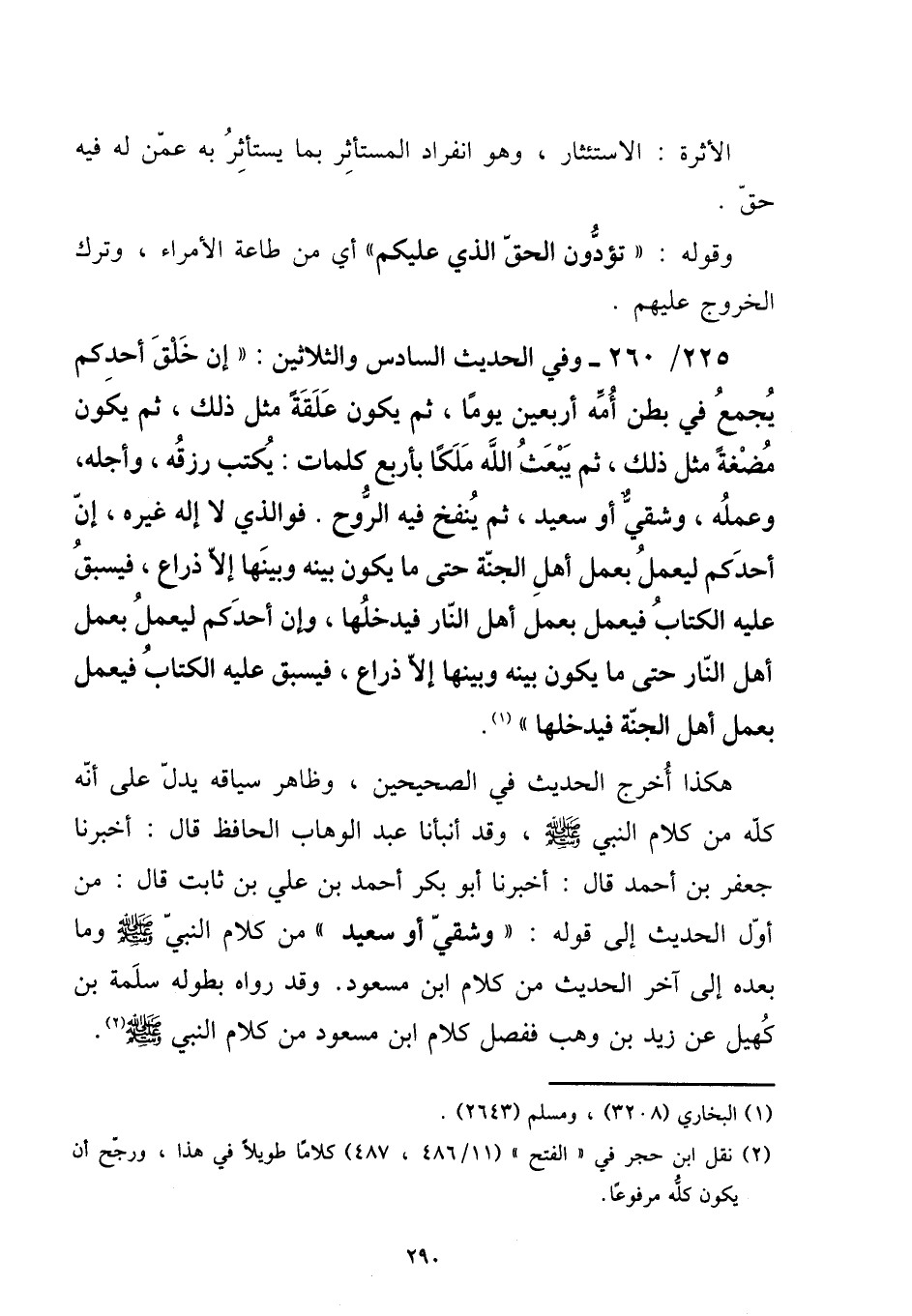 225 - / 260 - وَفِي الحَدِيث السَّادِس وَالثَّلَاثِينَ: " إِن خلق أحدكُم يجمع فِي بطن أمه أَرْبَعِينَ يَوْمًا، ثمَّ يكون علقَة مثل ذَلِك، ثمَّ يكون مُضْغَة مثل ذَلِك، ثمَّ يبْعَث الله ملكا بِأَرْبَع كَلِمَات: يكْتب رزقه، وأجله، وَعَمله، وشقي أَو سعيد، ثمَّ ينْفخ فِيهِ الرّوح. فو الَّذِي لَا إِلَه غَيره، إِن أحدكُم ليعْمَل بِعَمَل أهل الْجنَّة حَتَّى مَا يكون بَينه وَبَينهَا إِلَّا ذِرَاع، فَيَسْبق عَلَيْهِ الْكتاب فَيعْمل بِعَمَل أهل النَّار فيدخلها، وَإِن أحدكُم ليعْمَل بِعَمَل أهل النَّار حَتَّى مَا يكون بَينه وَبَينهَا إِلَّا ذِرَاع، فَيَسْبق عَلَيْهِ الْكتاب فَيعْمل بِعَمَل أهل الْجنَّة فيدخلها ".
