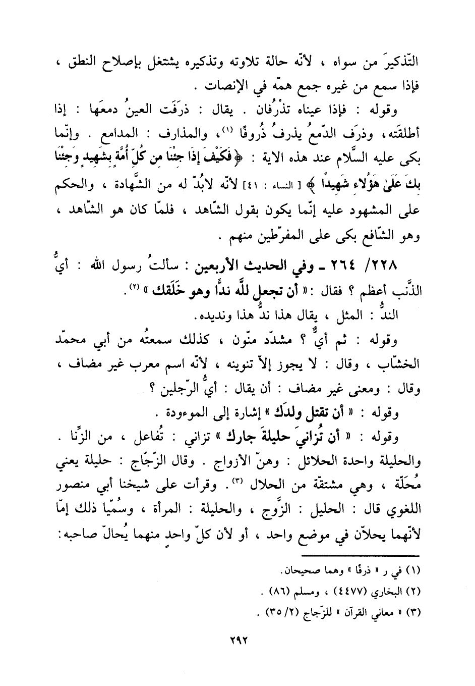 228 - / 264 - وَفِي الحَدِيث الْأَرْبَعين: سَأَلت رَسُول الله: أَي الذَّنب أعظم؟ فَقَالَ: " أَن تجْعَل لله ندا وَهُوَ خلقك ".