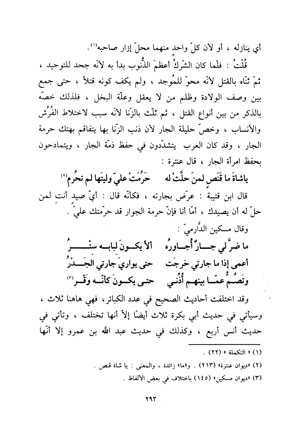 قلت: فَلَمَّا كَانَ الشّرك أعظم الذُّنُوب بَدَأَ بِهِ لِأَنَّهُ جحد للتوحيد، ثمَّ ثناه بِالْقَتْلِ لِأَنَّهُ محو للموجد، وَلم يكف كَونه قتلا، حَتَّى جمع بَين وصف الْولادَة وظلم من لَا يعقل وَعلة الْبُخْل، فَلذَلِك خصّه بِالذكر من بَين أَنْوَاع الْقَتْل، ثمَّ ثلث بِالزِّنَا لِأَنَّهُ سَبَب لاختلاط الْفرش والأنساب، وَخص حَلِيلَة الْجَار لِأَن ذَنْب الزِّنَا بهَا يَتَفَاقَم بهتك حُرْمَة الْجَار، وَقد كَانَ الْعَرَب يتشددون فِي حفظ ذمَّة الْجَار، ويتمادحون بِحِفْظ امْرَأَة الْجَار، قَالَ عنترة: