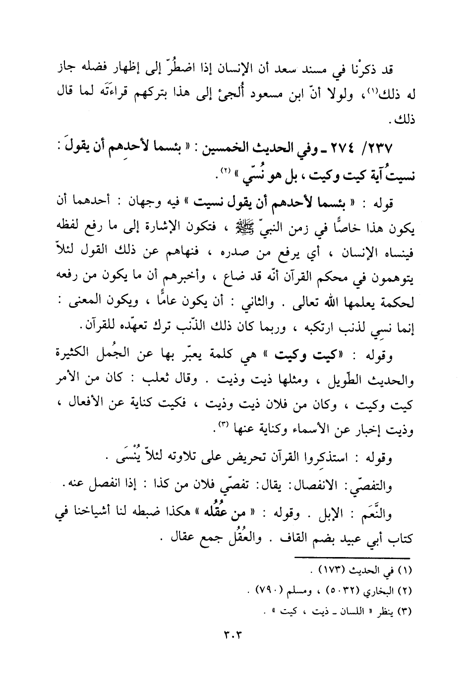 237 - / 274 - وَفِي الحَدِيث الْخمسين: " بئْسَمَا لأَحَدهم أَن يَقُول: نسيت آيَة كَيْت وَكَيْت، بل هُوَ نسي ".