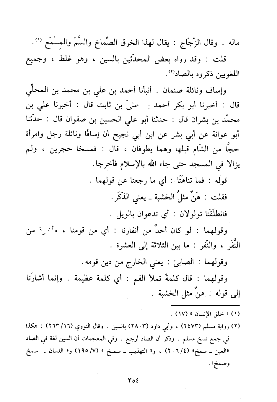 قلت: وَقد رَوَاهُ بعض الْمُحدثين بِالسِّين، وَهُوَ غلط، وَجَمِيع اللغويين ذَكرُوهُ بالصَّاد.