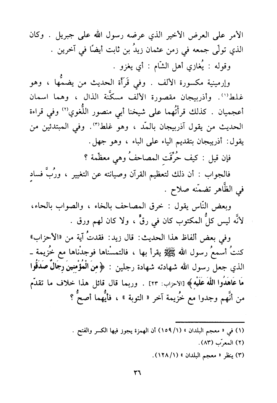 الْأَمر على الْعرض الْأَخير الَّذِي عرضه رَسُول الله على جِبْرِيل. وَكَانَ الَّذِي تولى جمعه فِي زمن عُثْمَان زيد بن ثَابت أَيْضا فِي آخَرين.