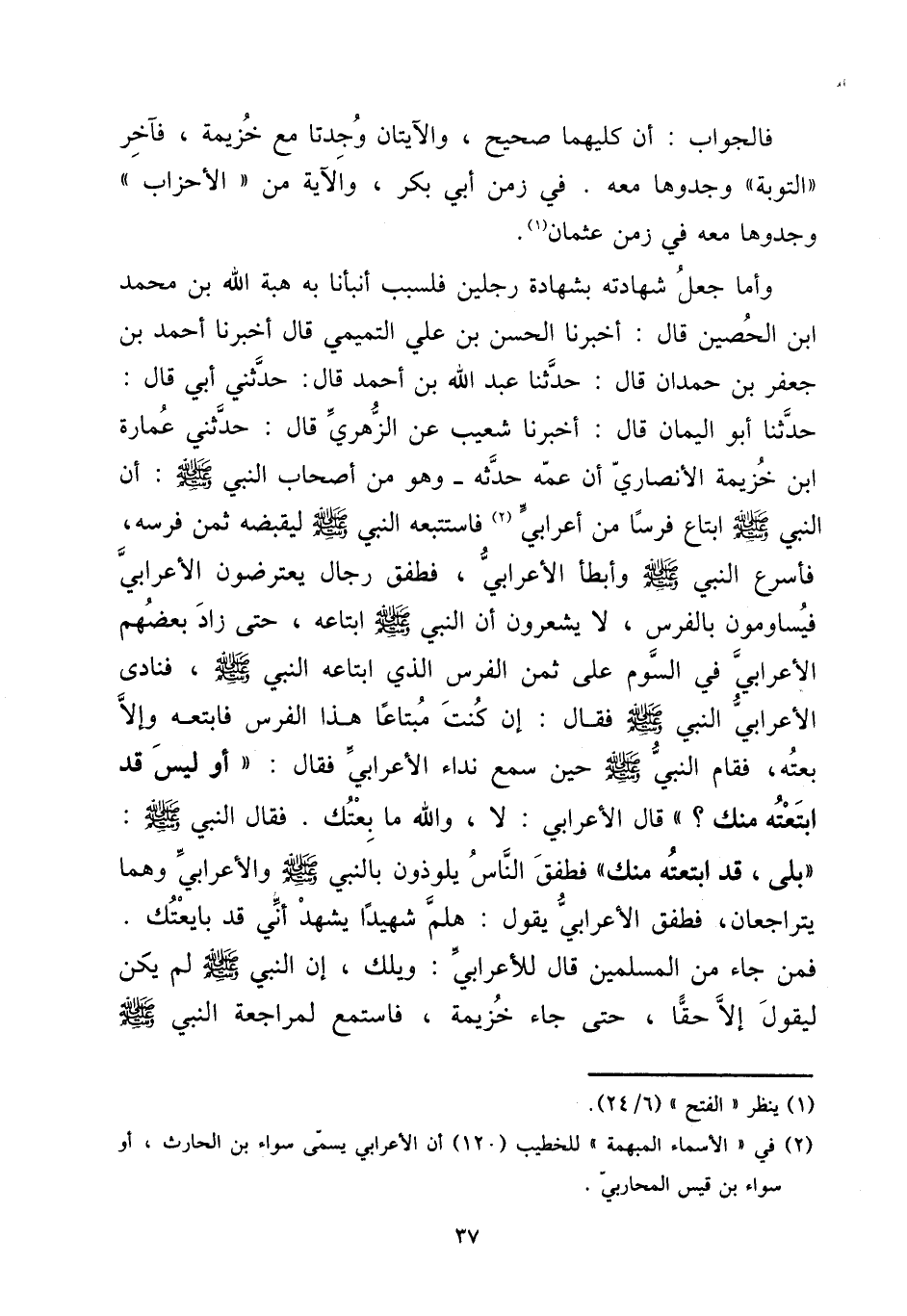 وَأما جعل شَهَادَته بِشَهَادَة رجلَيْنِ فلسبب أَنبأَنَا بِهِ هبة الله بن مُحَمَّد ابْن الْحصين قَالَ: أخبرنَا الْحسن بن عَليّ التَّمِيمِي قَالَ أخبرنَا أَحْمد بن جَعْفَر بن حمدَان قَالَ: حَدثنَا عبد الله بن أَحْمد قَالَ: حَدثنِي أبي قَالَ: حَدثنَا أَبُو الْيَمَان قَالَ: أخبرنَا شُعَيْب عَن الزُّهْرِيّ قَالَ: حَدثنِي عمَارَة ابْن خُزَيْمَة الْأنْصَارِيّ أَن عَمه حَدثهُ - وَهُوَ من أَصْحَاب النَّبِي صلى الله عَلَيْهِ وَسلم: أَن النَّبِي صلى الله عَلَيْهِ وَسلم ابْتَاعَ فرسا من أَعْرَابِي فاستتبعه النَّبِي صلى الله عَلَيْهِ وَسلم ليقبضه ثمن فرسه، فأسرع النَّبِي صلى الله عَلَيْهِ وَسلم وَأَبْطَأ الْأَعرَابِي، فَطَفِقَ رجال يعترضون الْأَعرَابِي فيساومون بالفرس، لَا يَشْعُرُونَ أَن النَّبِي صلى الله عَلَيْهِ وَسلم ابتاعه، حَتَّى زَاد بَعضهم الْأَعرَابِي فِي السّوم على ثمن الْفرس الَّذِي ابتاعه النَّبِي صلى الله عَلَيْهِ وَسلم، فَنَادَى الْأَعرَابِي النَّبِي صلى الله عَلَيْهِ وَسلم فَقَالَ: إِن كنت مبتاعا هَذَا الْفرس فابتعه وَإِلَّا بِعته، فَقَامَ النَّبِي صلى الله عَلَيْهِ وَسلم حِين سمع نِدَاء الْأَعرَابِي فَقَالَ: " أَو لَيْسَ قد ابتعته مِنْك؟ " قَالَ الْأَعرَابِي: لَا، وَالله مَا بِعْتُك. فَقَالَ النَّبِي صلى الله عَلَيْهِ وَسلم: " بلَى، قد ابتعته مِنْك " فَطَفِقَ النَّاس يلوذون بِالنَّبِيِّ صلى الله عَلَيْهِ وَسلم والأعرابي وهما يتراجعان، فَطَفِقَ الْأَعرَابِي يَقُول: هَلُمَّ شَهِيدا يشْهد أَنِّي قد بَايَعْتُك. فَمن جَاءَ من الْمُسلمين قَالَ للأعرابي: وَيلك، إِن النَّبِي صلى الله عَلَيْهِ وَسلم لم يكن ليقول إِلَّا حَقًا، حَتَّى جَاءَ خُزَيْمَة، فاستمع لمراجعة النَّبِي صلى الله عَلَيْهِ وَسلم