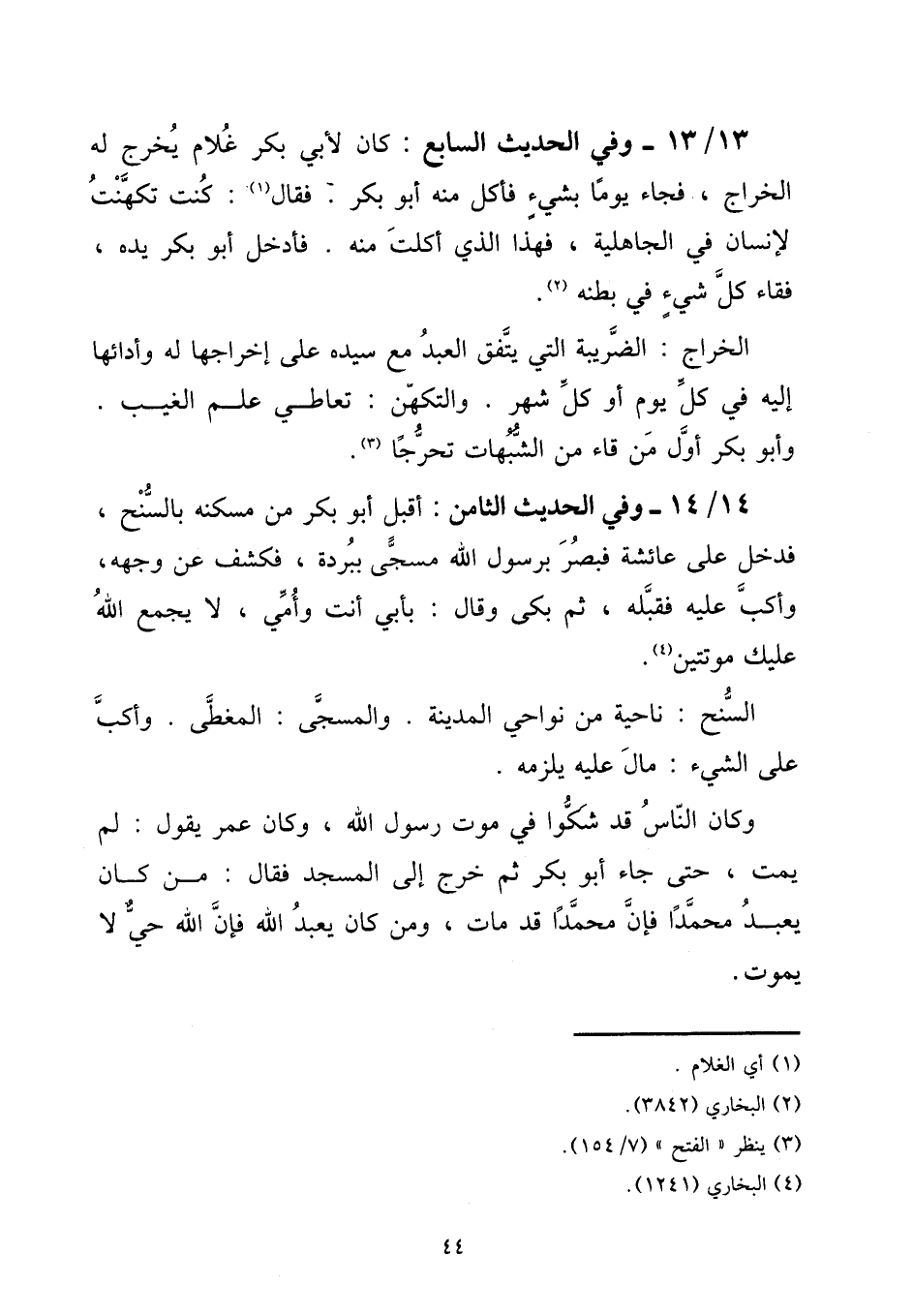 13 - / 13 - وَفِي الحَدِيث السَّابِع: كَانَ لأبي بكر غُلَام يخرج لَهُ الْخراج، فجَاء يَوْمًا بِشَيْء فَأكل مِنْهُ أَبُو بكر. فَقَالَ: كنت تكهنت لإِنْسَان فِي الْجَاهِلِيَّة، فَهَذَا الَّذِي أكلت مِنْهُ. فَأدْخل أَبُو بكر يَده، فقاء كل شَيْء فِي بَطْنه.