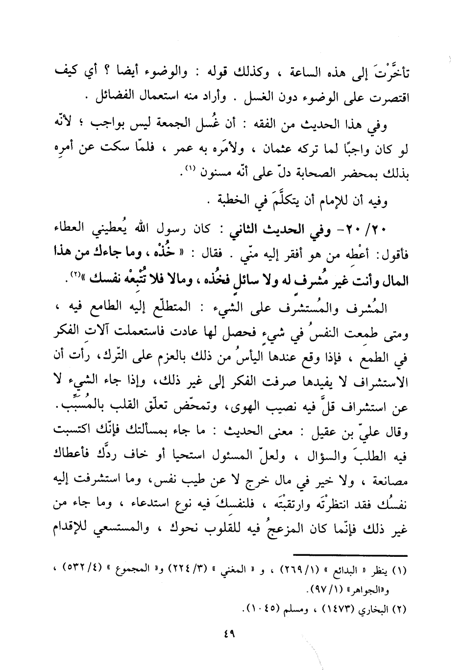 20 - / 20 - وَفِي الحَدِيث الثَّانِي: كَانَ رَسُول الله يعطيني الْعَطاء فَأَقُول: أعْطه من هُوَ أفقر إِلَيْهِ مني. فَقَالَ: " خُذْهُ، وَمَا جَاءَك من هَذَا المَال وَأَنت غير مشرف لَهُ وَلَا سَائل فَخذه، ومالا فَلَا تتبعه نَفسك ".