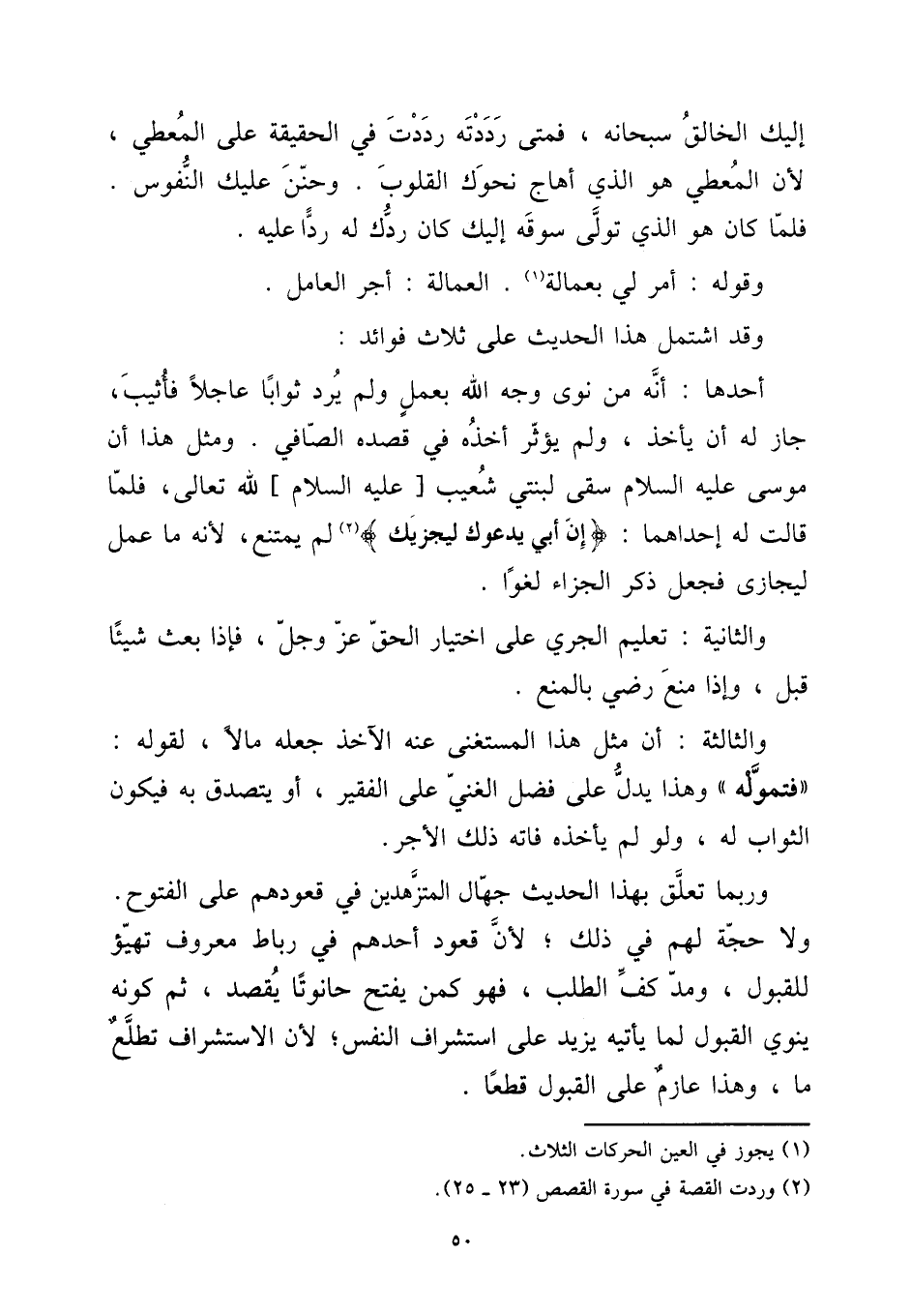 أَحدهَا: أَنه من نوى وَجه الله بِعَمَل وَلم يرد ثَوابًا عَاجلا فأثيب، جَازَ لَهُ أَن يَأْخُذ، وَلم يُؤثر أَخذه فِي قَصده الصافي. وَمثل هَذَا أَن مُوسَى عَلَيْهِ السَّلَام سقى لبنتي شُعَيْب [عَلَيْهِ السَّلَام] لله تَعَالَى، فَلَمَّا قَالَت لَهُ إِحْدَاهمَا: {إِن أبي يَدْعُوك ليجزيك} لم يمْتَنع، لِأَنَّهُ مَا عمل ليجازى فَجعل ذكر الْجَزَاء لَغوا.