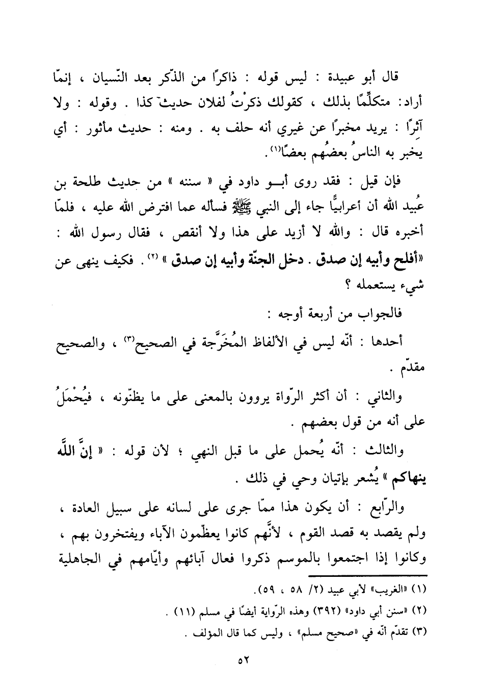 فَإِن قيل: فقد روى أَبُو دَاوُد فِي " سنَنه " من حَدِيث طَلْحَة بن عبيد الله أَن أَعْرَابِيًا جَاءَ إِلَى النَّبِي صلى الله عَلَيْهِ وَسلم فَسَأَلَهُ عَمَّا افْترض الله عَلَيْهِ، فَلَمَّا أخبرهُ قَالَ: وَالله لَا أَزِيد على هَذَا وَلَا أنقص، فَقَالَ رَسُول الله: " أَفْلح وَأَبِيهِ إِن صدق. دخل الْجنَّة وَأَبِيهِ إِن صدق ". فَكيف ينْهَى عَن شَيْء يَسْتَعْمِلهُ؟